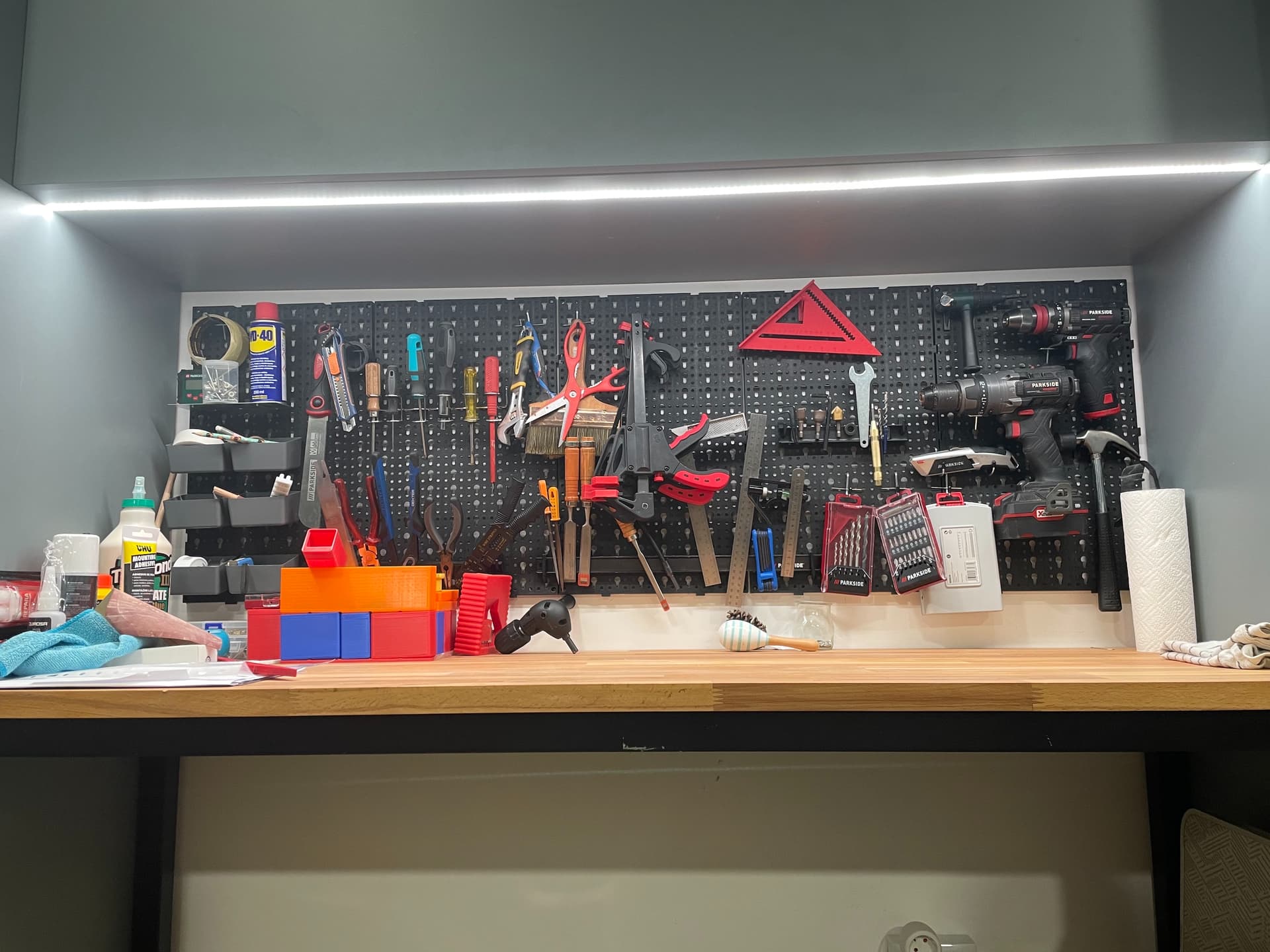 En la parte de abajo he puesto un canal de aluminio, solo me falta colocar la tira de led y conectarla a un relé wifi para tener el banco perfectamente iluminado cuando trabajo con cosas pequeñitas. Y en el interior voy a pasar un cable para poner dos o tres enchufes para colocar los cargadores de baterías ahí.