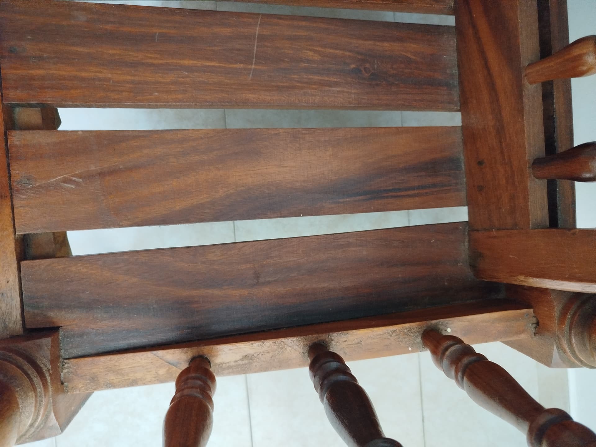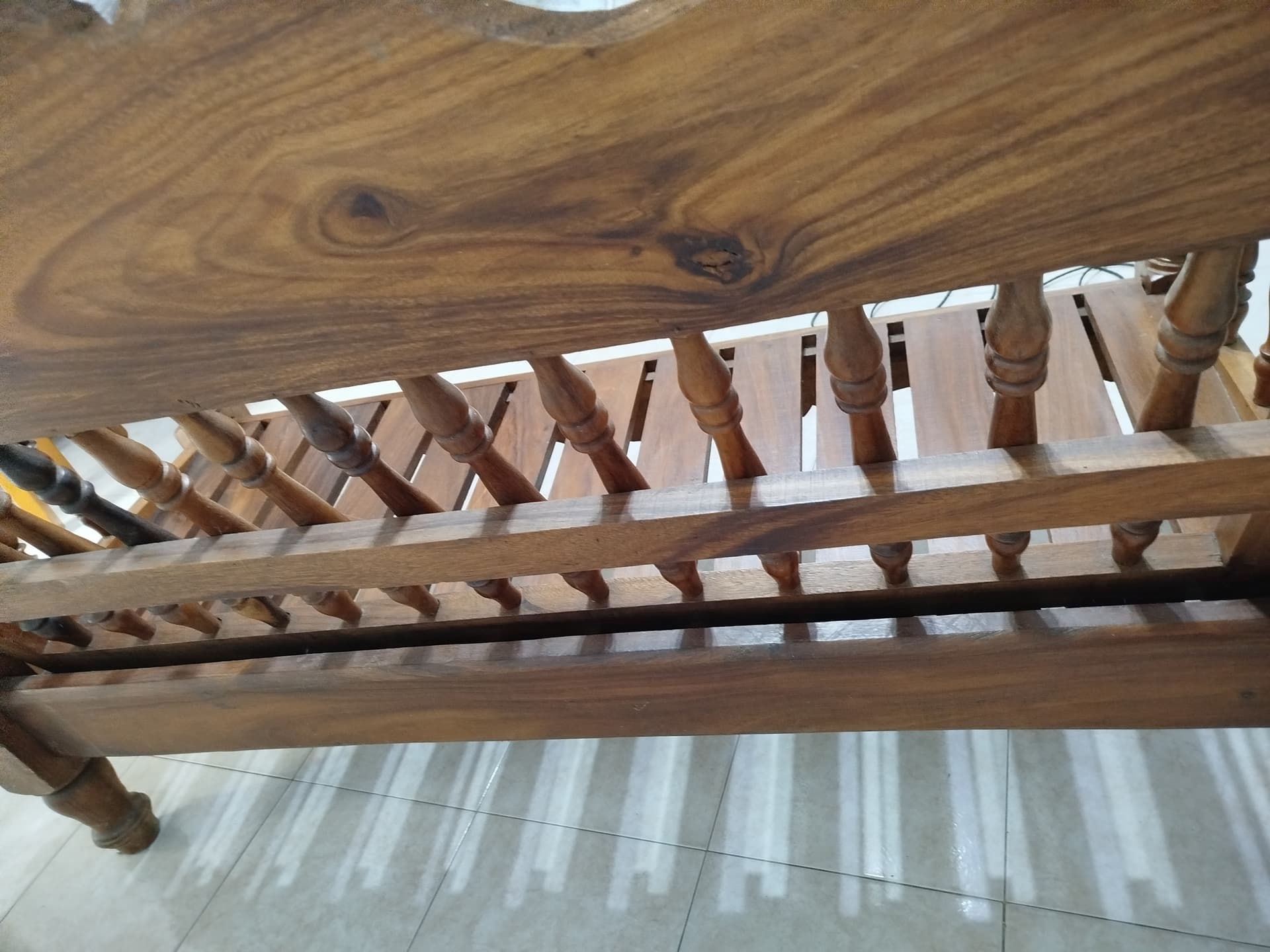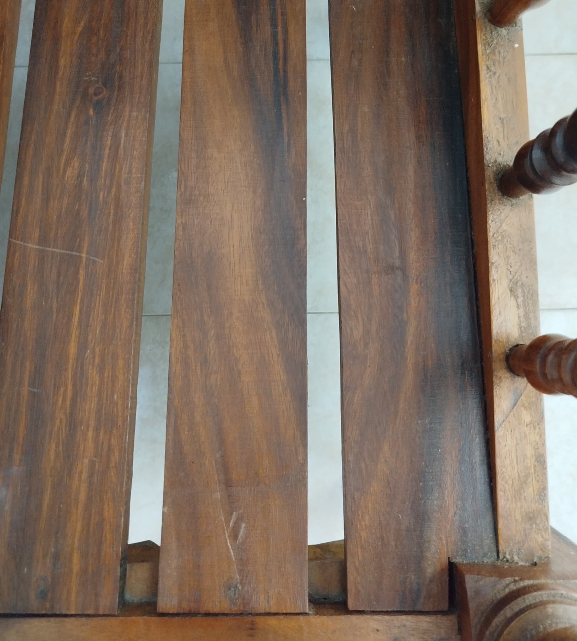 Asi a bote pronto yo diría que se trata por una parte de una madera bastante oscura maciza de árbol torneada y por otra cepillada sin mas.