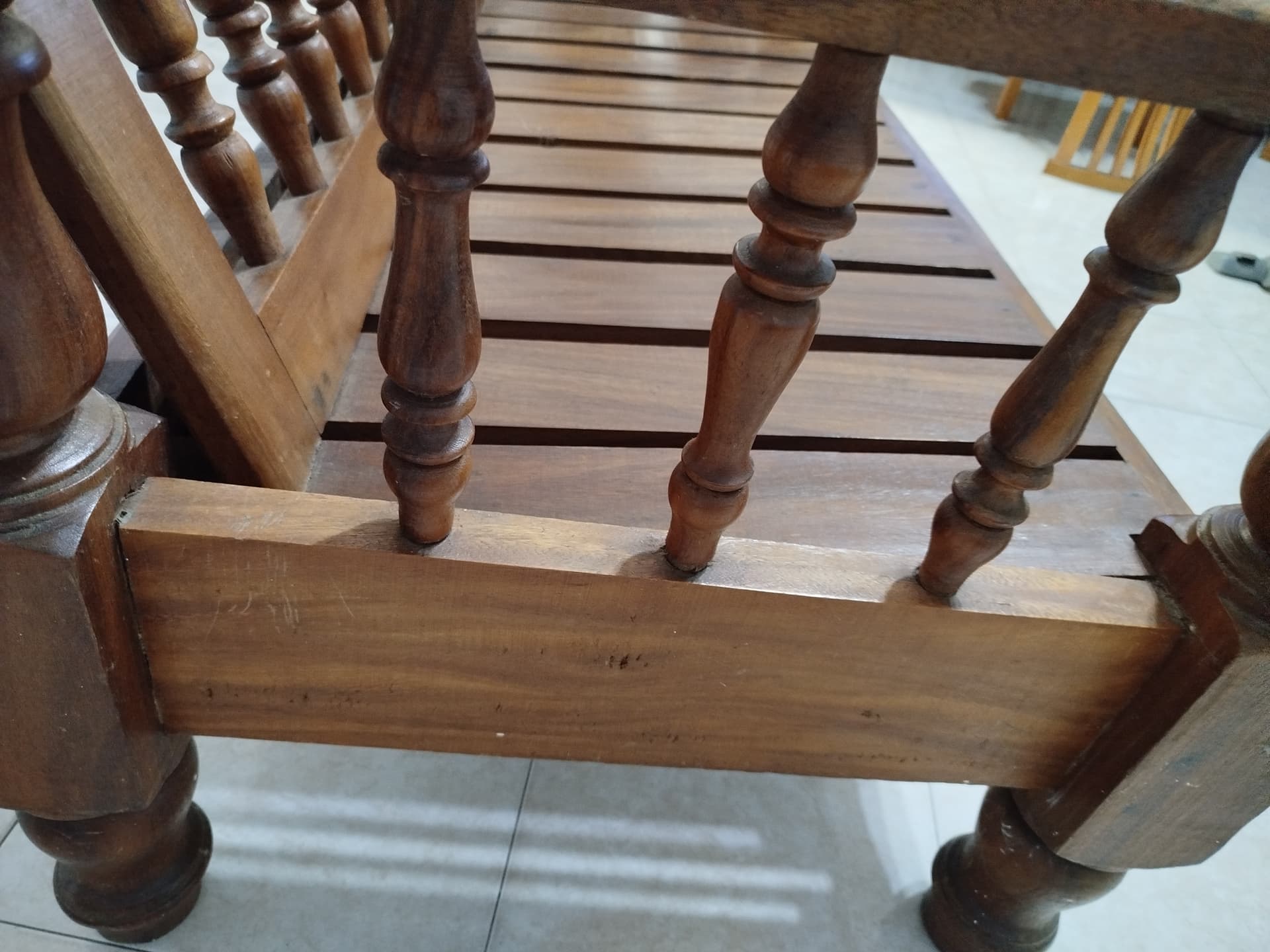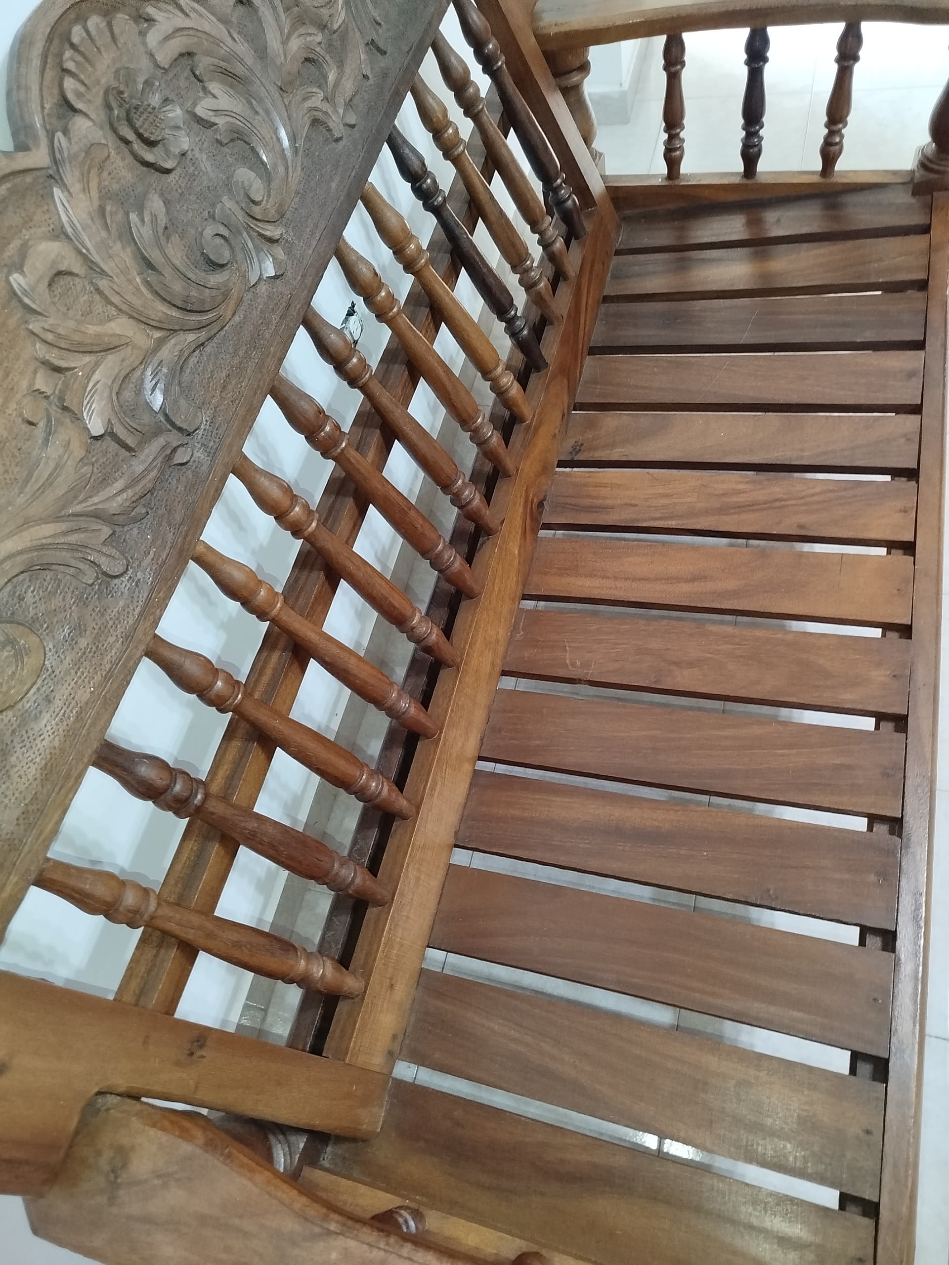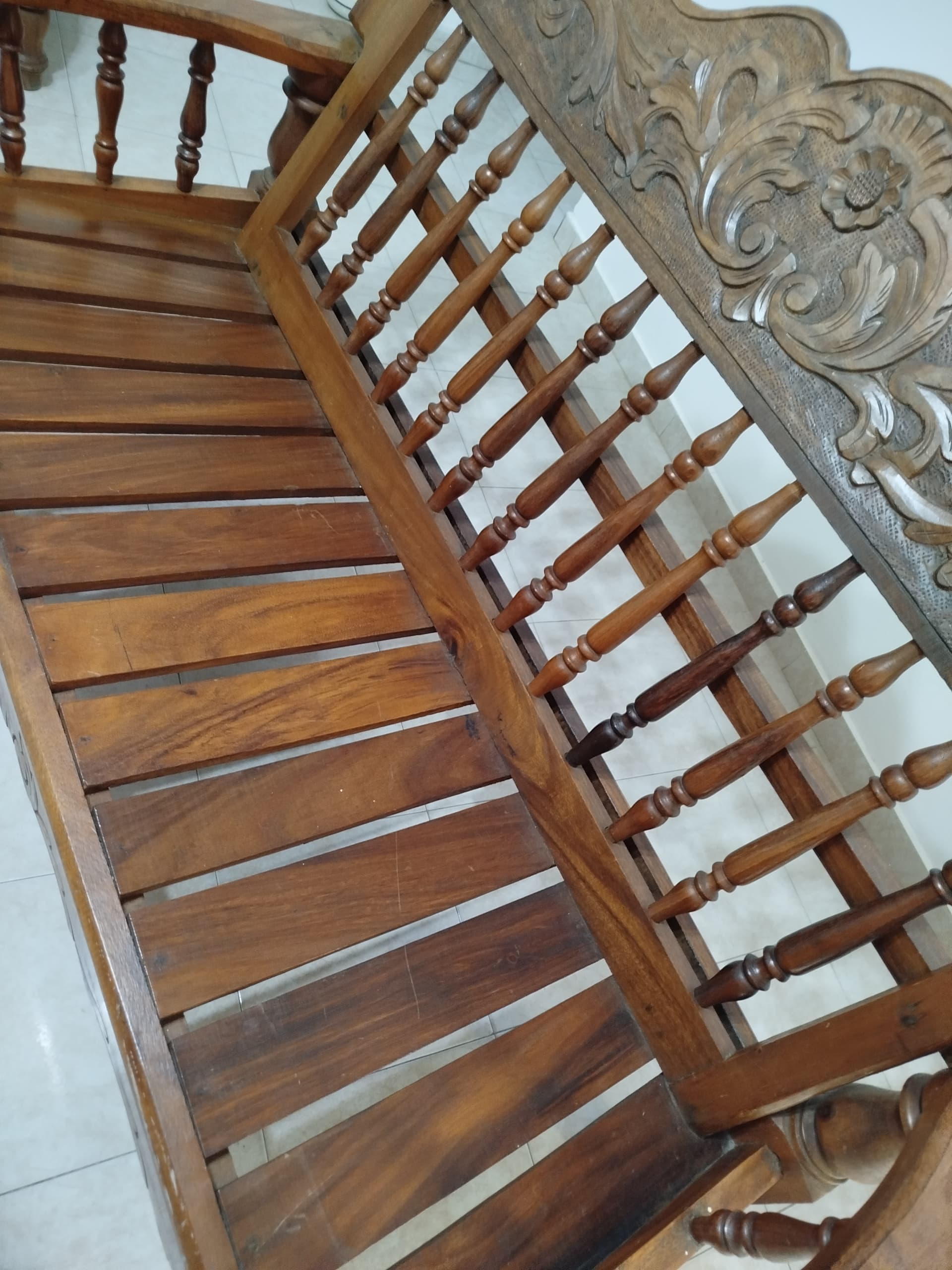 Asi a bote pronto yo diría que se trata por una parte de una madera bastante oscura maciza de árbol torneada y por otra cepillada sin mas.