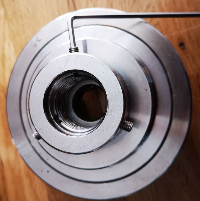 Entonces decidí reformar los platos haciéndoles tres agujeros roscados equidistantes para que apretasen en el cuello que queda justo al final de la rosca del eje del torno de forma equilibrada.