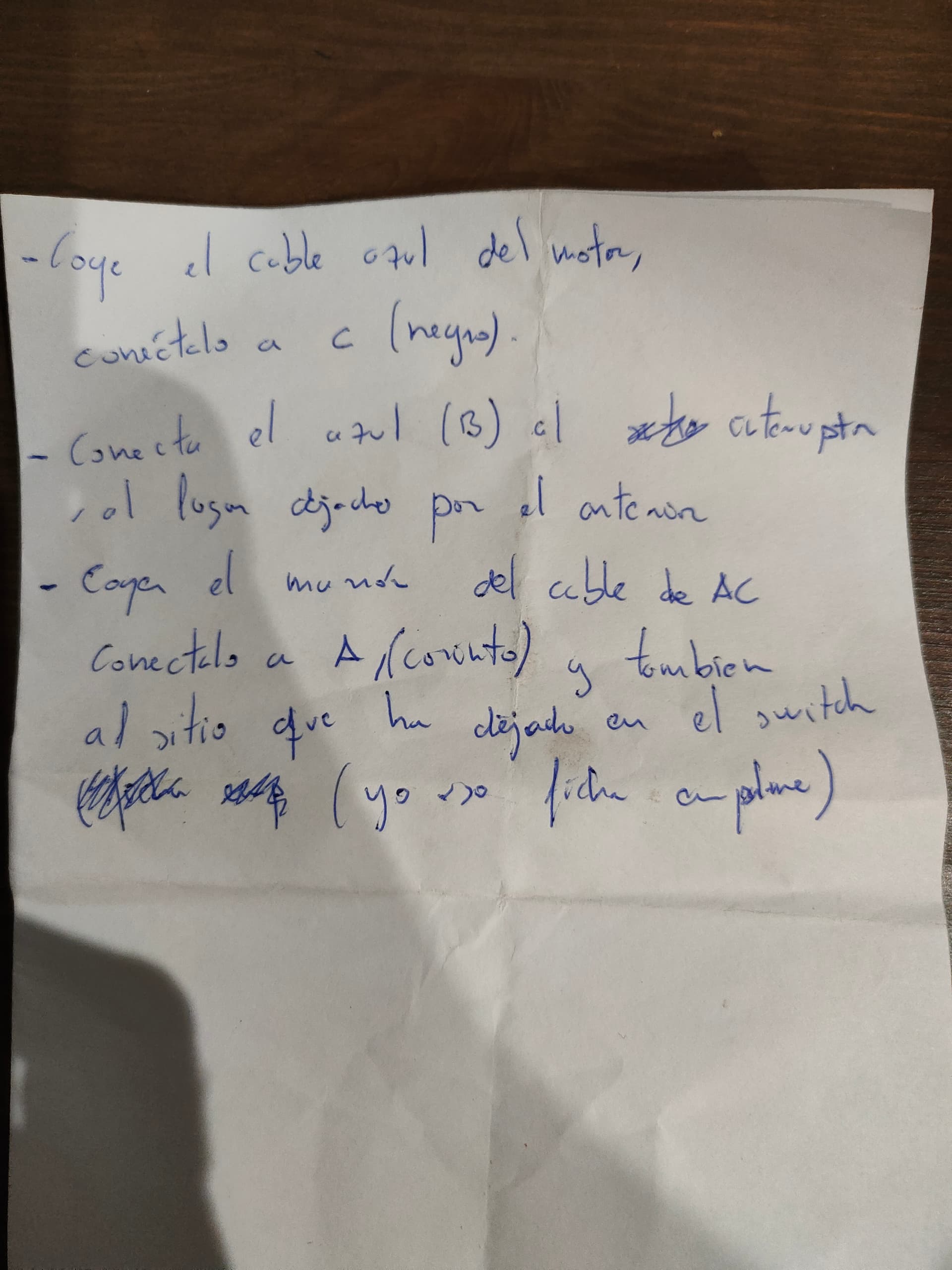 Respecto a lo que comentas de conectar al motor y al interruptor. Me tengo que ver el vídeo de nuevo que no lo recuerdo. Escribo de nuevo cuando lo tenga claro.