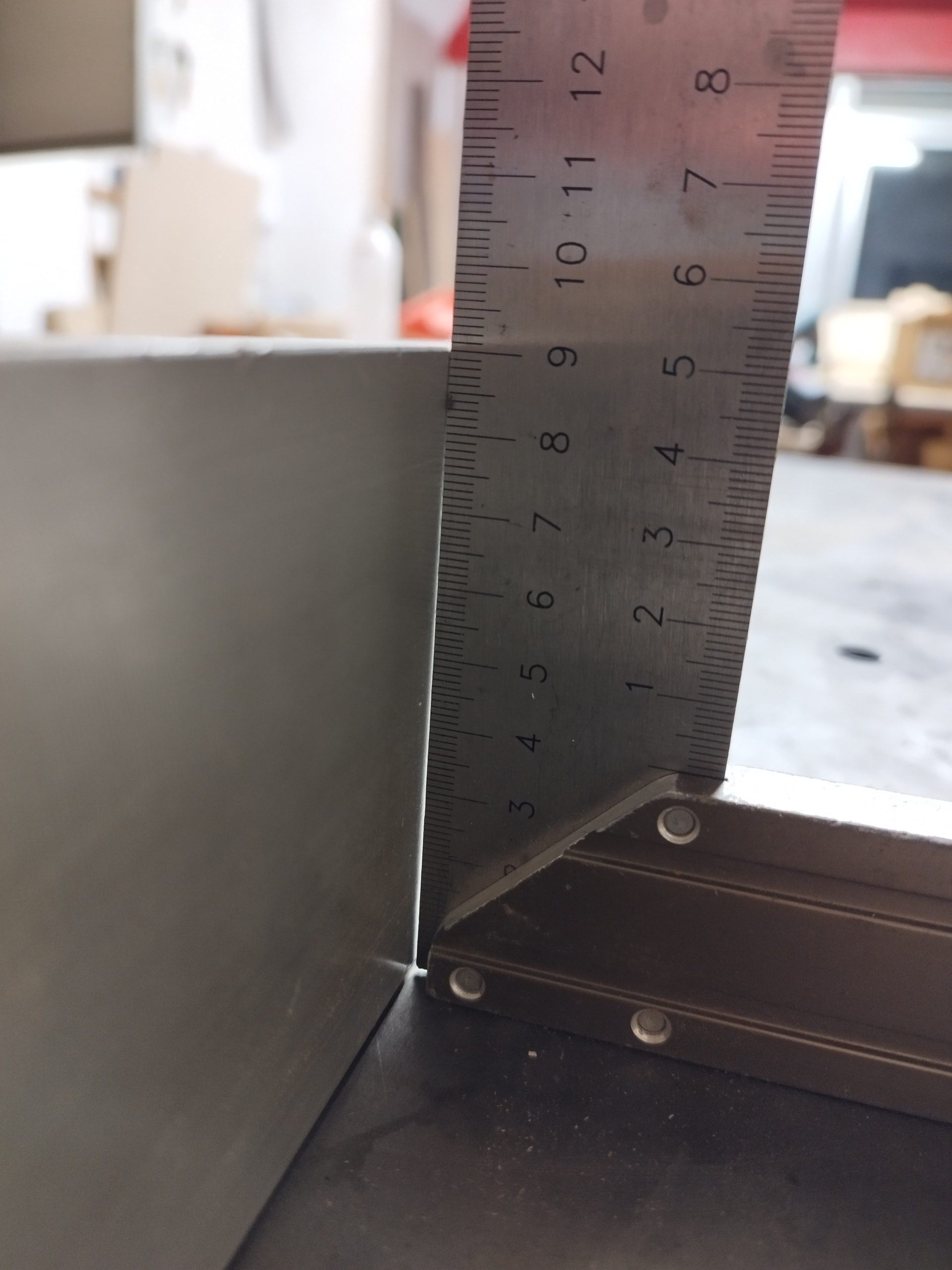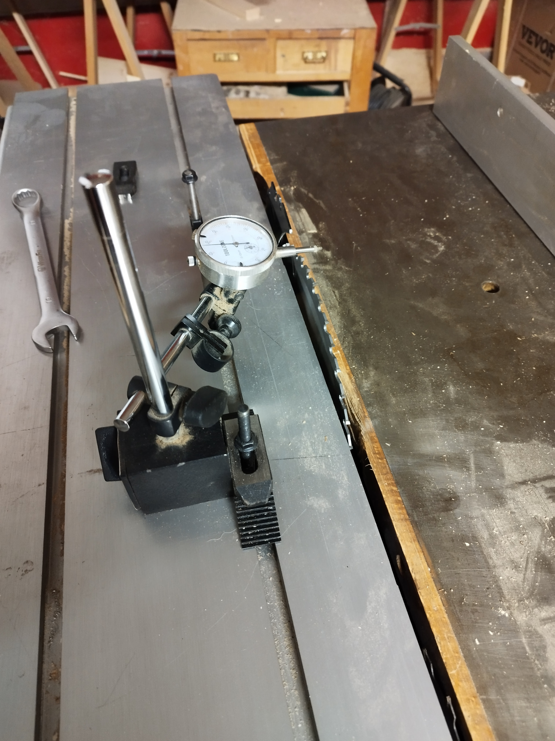 Por otro lado he estado mirando la escuadra entre la guía y la mesa y falta un poco, mañana me pondré con ello. Os adjunto foto, no sé si será relevante esa desviación pero ya que estoy lo dejaré bien, no es demasiado complicado de ajustar, aunque si tedioso. En este caso hay que aflojar la mesa e ir moviendo las tuercas hasta dejarlo bien, una horita ya estaré