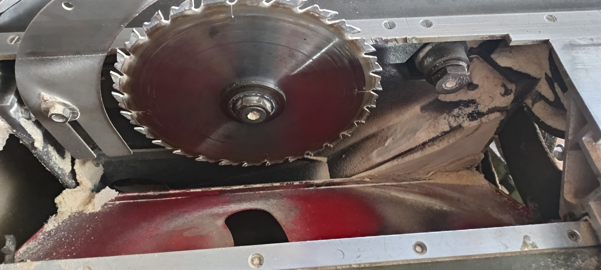 Las sierras actuales están pensadas para que les pongas aspiración, las viejas estaban abiertas por abajo y el serrín caía por su peso,pero ahora al hacerlas pensando en canalizar la aspiración se acomulacel serrín y lo tira por arriba.