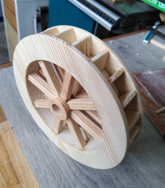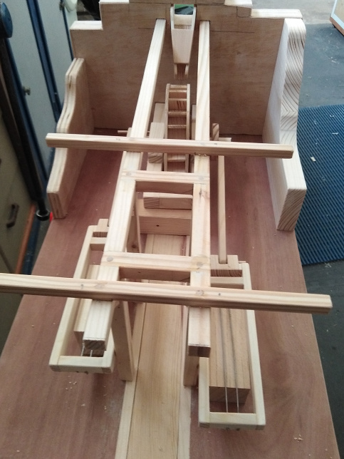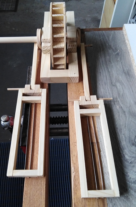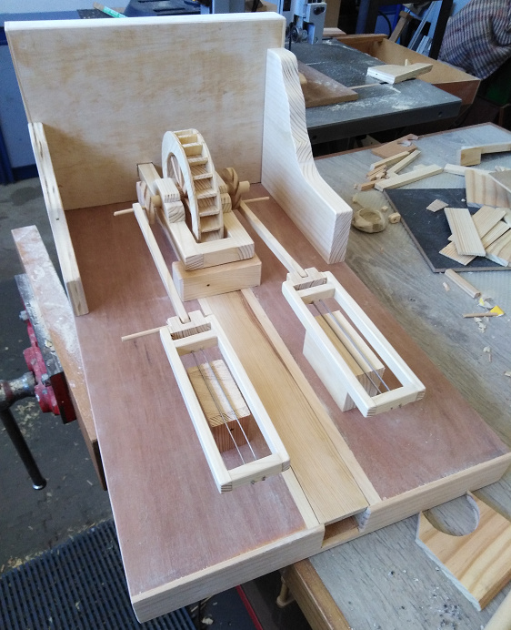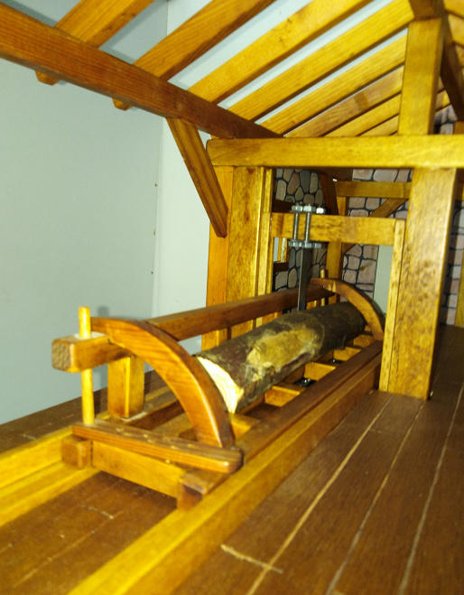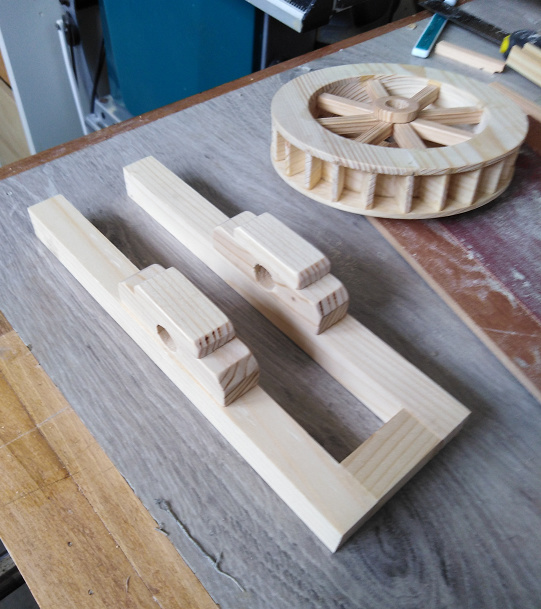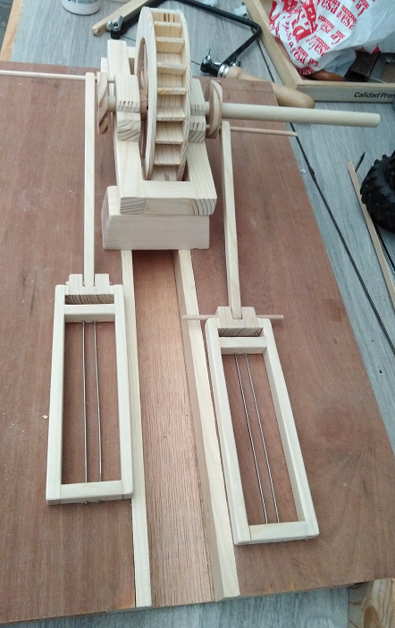 Es una sierra Romana para cortar láminas de piedra, en la documentación que he visto hay dos tipos según hipótesis: la de Hierápolis que lleva las bielas longitudinales en un solo lado y la de Gerasa que es el modelo que he decidido intentar hacer que lleva las bielas una a cada lado de la rueda Hidráulica