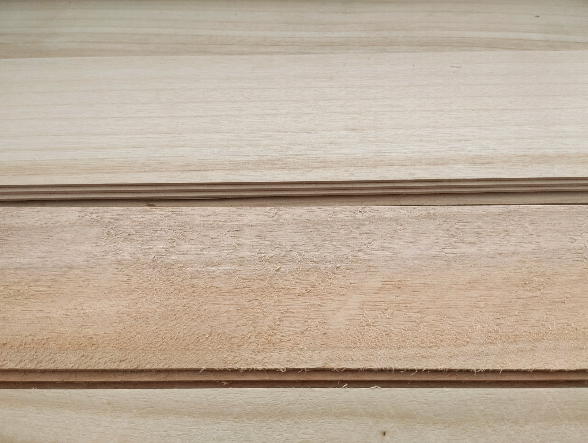La mayoría de la madera es mas blanca, pero una parte puede ser mas oscura. Que me acuerdo no debería de ser la causa del deshilachamiento. Es debido a su poca densidad, el muy ligero y las fibras, sueltas, se arancan en vez de cortarse sobre todo en sierras eléctricas (rapidas). Tienen que estar muy bien afiladas. Y c omo el chopo no suele estar destinado a ebanistria, ni carpinteria clásica y menos estructural, sino a palets, palillos, cajas y no suele estar escojido como otras esencias. Creo recordar que para placage se abre con una cuchilla lisa, como raseras.