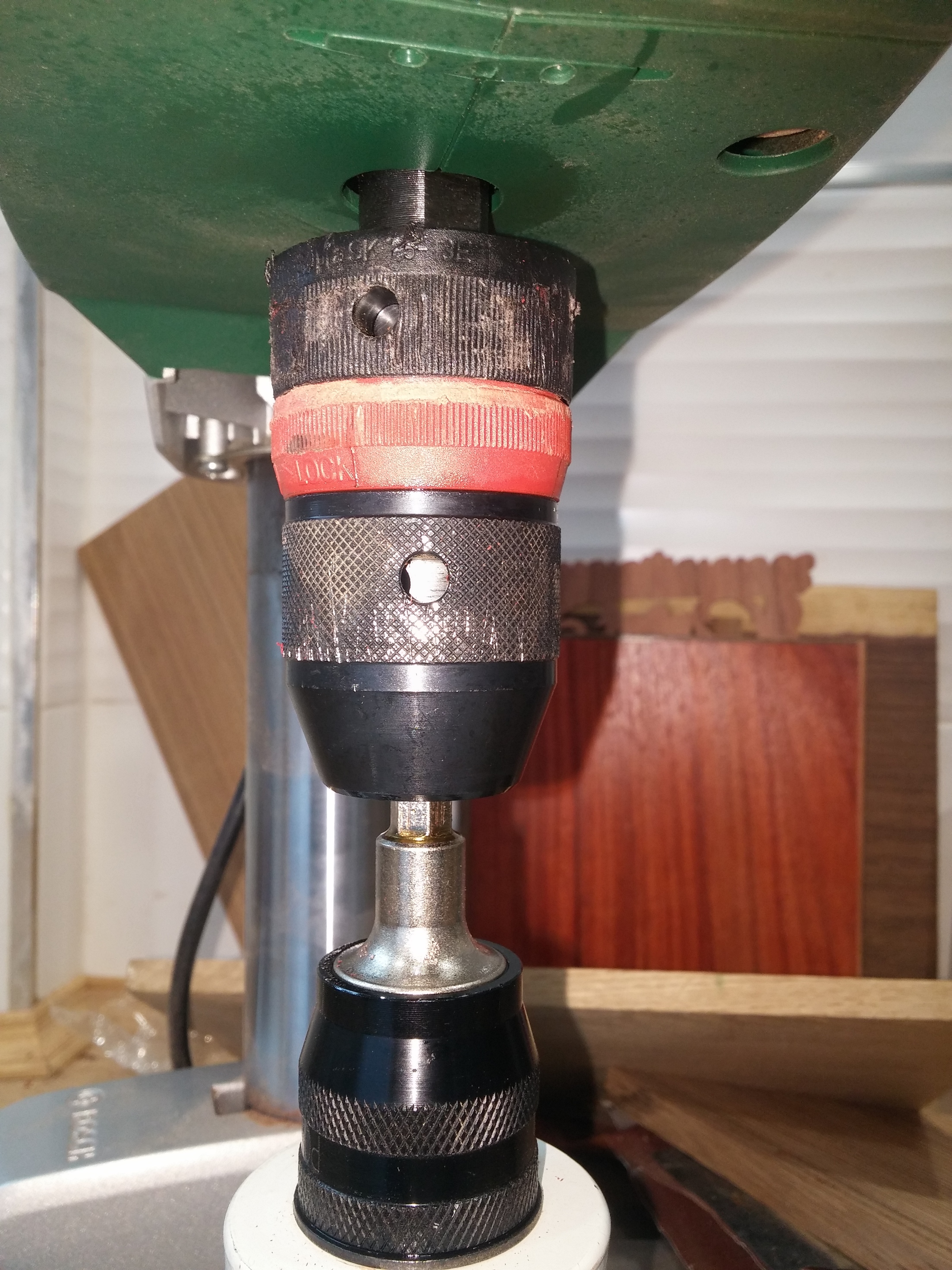 Asi que obviando el bloqueo del eje que tu haces yo haria como en el mio que es un taladro antiguo con un portabrocas B16 nuevo de ese tipo (sin llave).