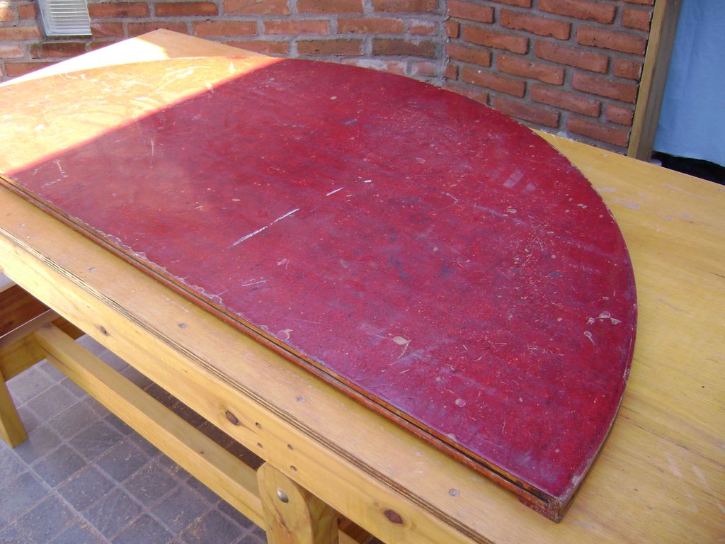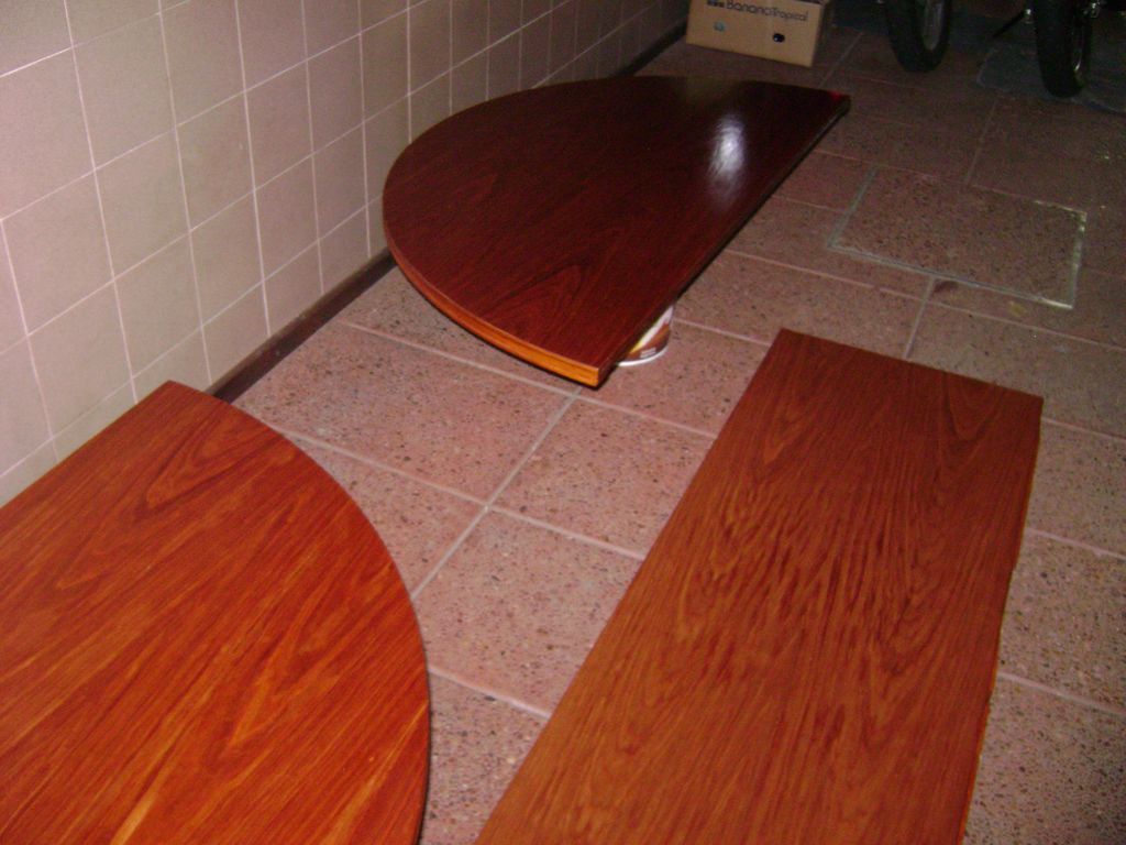 esta mesa de las fotos era de aglomerado (peor que el MDF) con el borde de madera maciza y alguien habia pintado el enchapado en color rojo, se quito el enchapado pintado y la enchape en cerezo y asi quedó (no tengo fotos de la mesa armada )