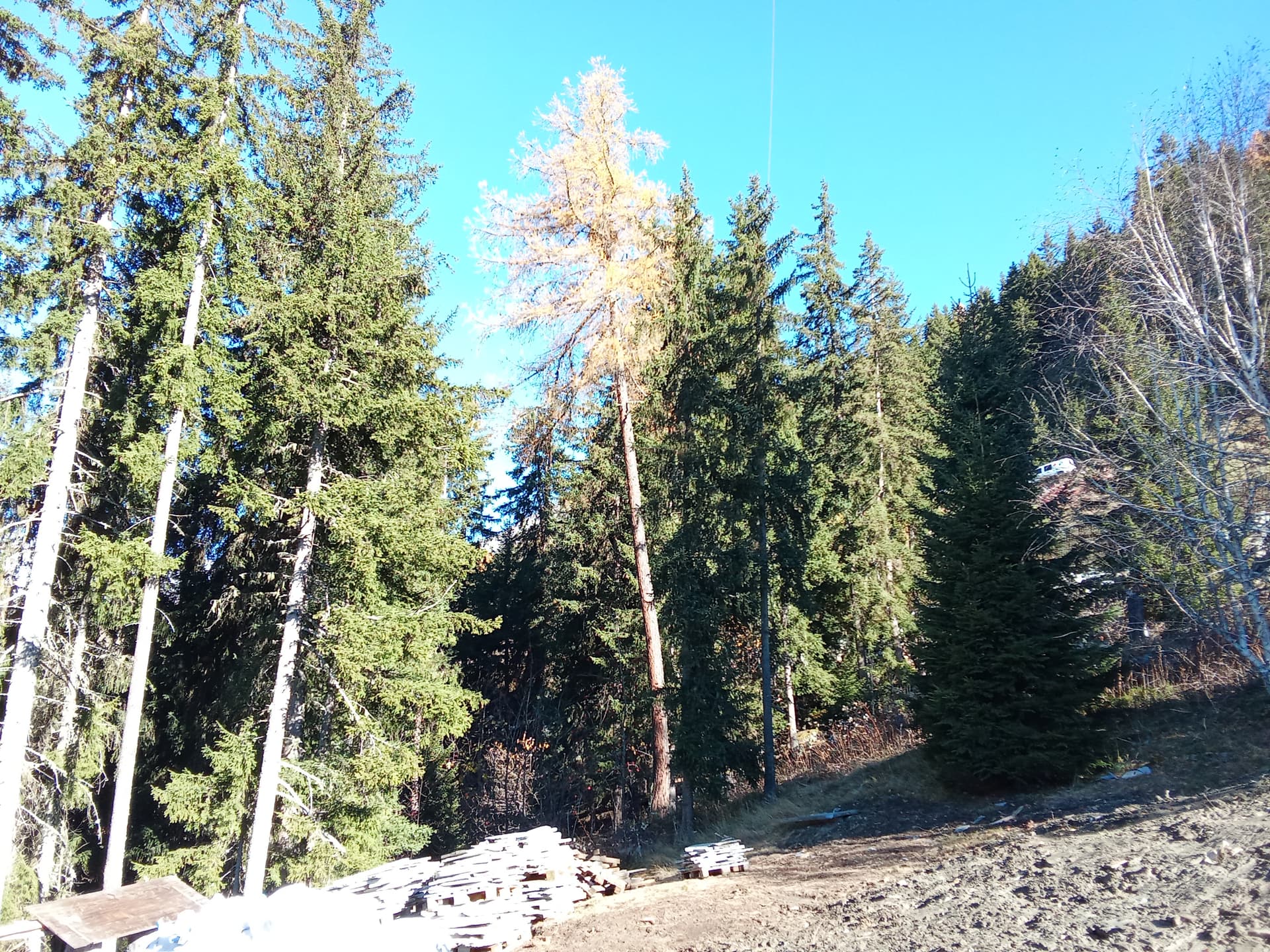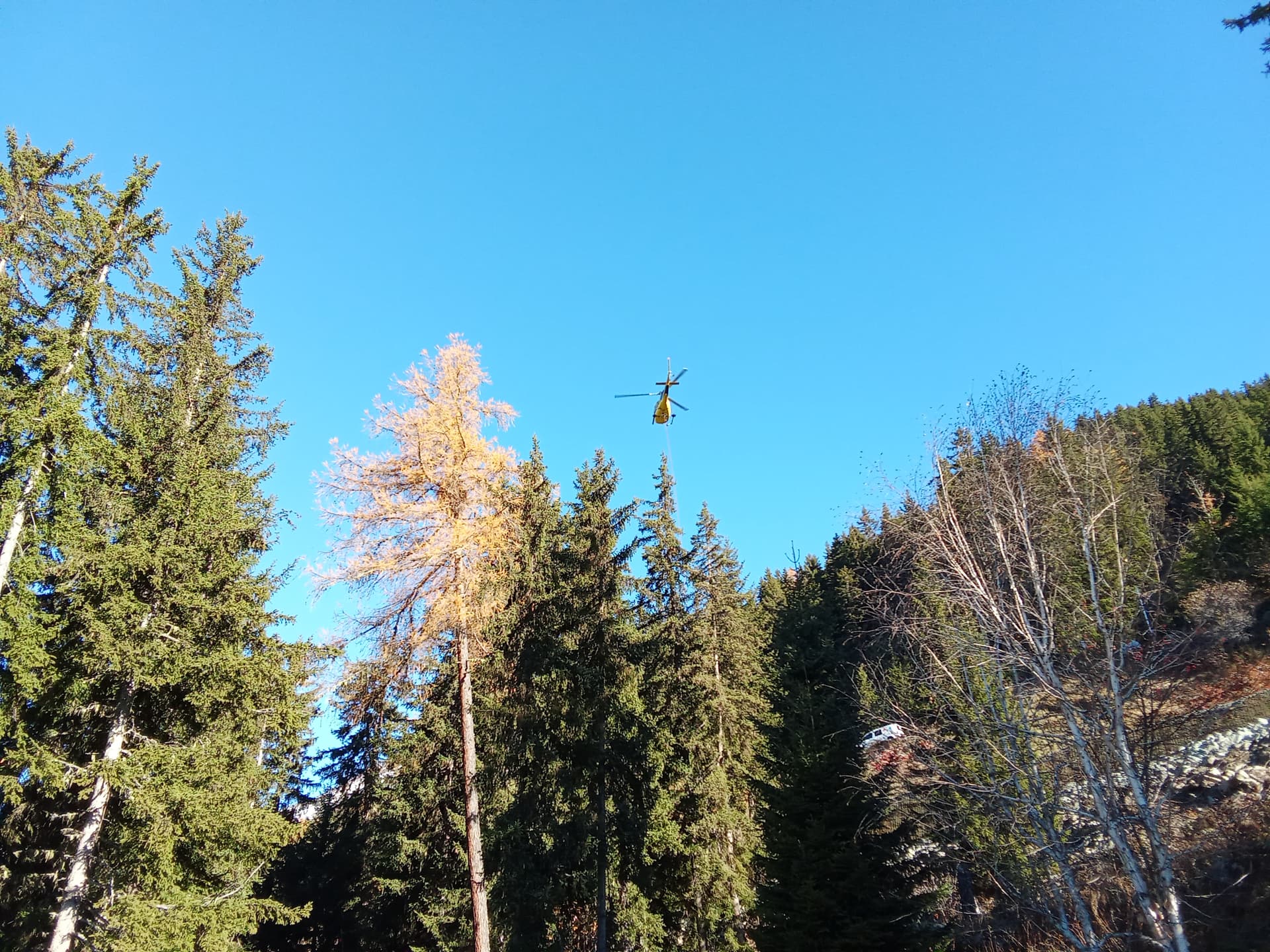 En esta foto , enfrente de donde estoy trabajando hoy , se ven los pinos y un meleze, con los colores del otoño, como curiosidad está el helicóptero, se utiliza para cargar y descargar materiales en sitios difíciles