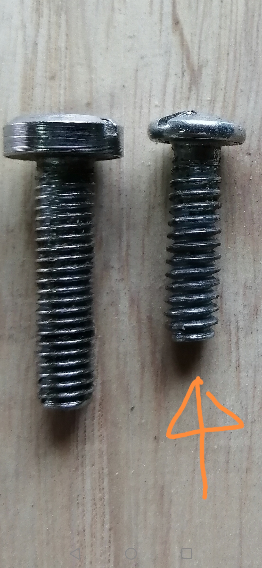 El de la izquierda es un tornillo M6, el de la derecha con la flecha es como el que necesito, fui a varias ferreterías de aquí pero no encontré nada parecido, si alguien supiera con exactitud que medida y paso tiene, lo pido por Internet, supongo que será una métrica imperial, pero no tengo ni idea. El diámetro es 5,3 mm, es igual que los que sujetan la cama.