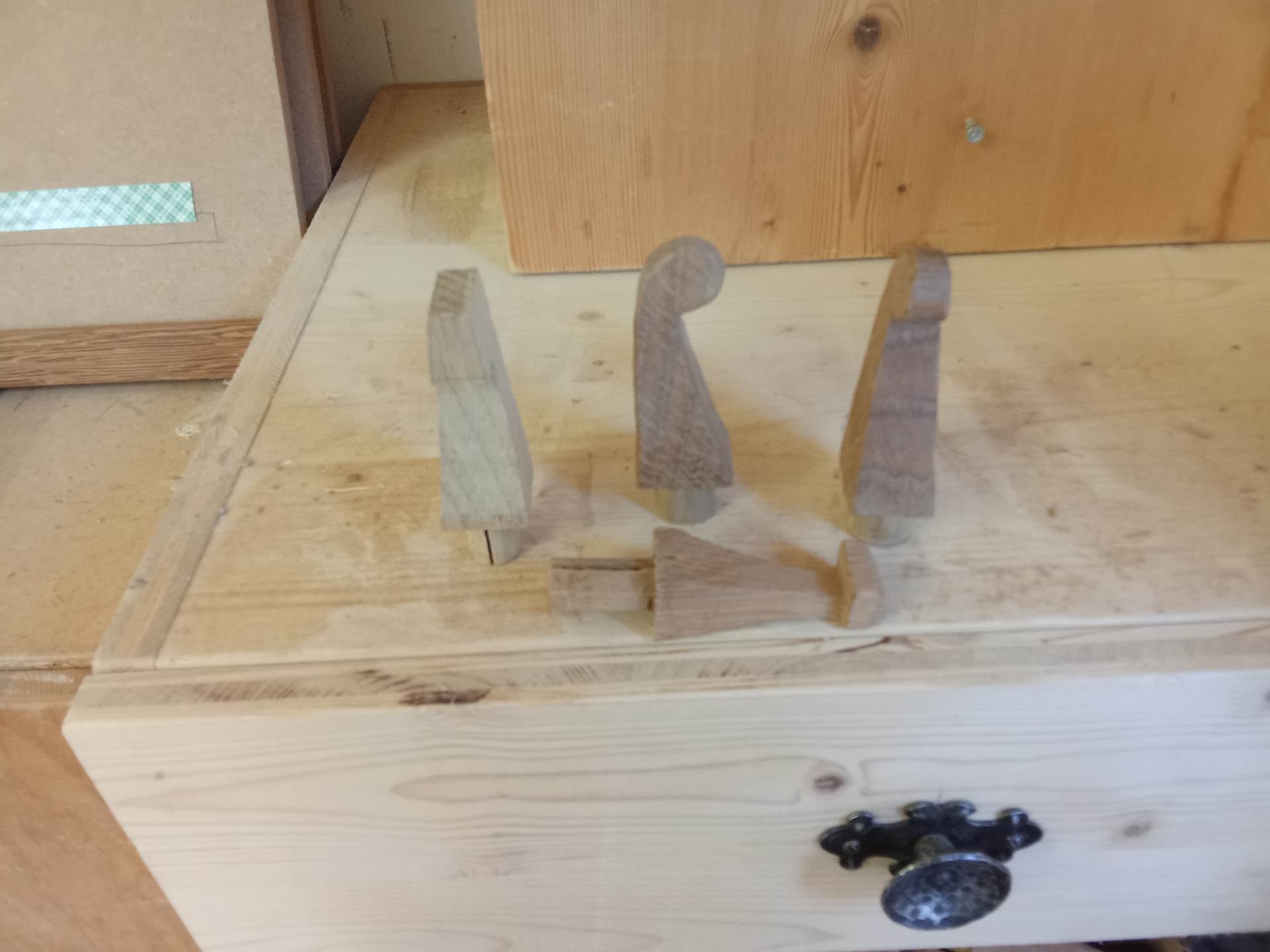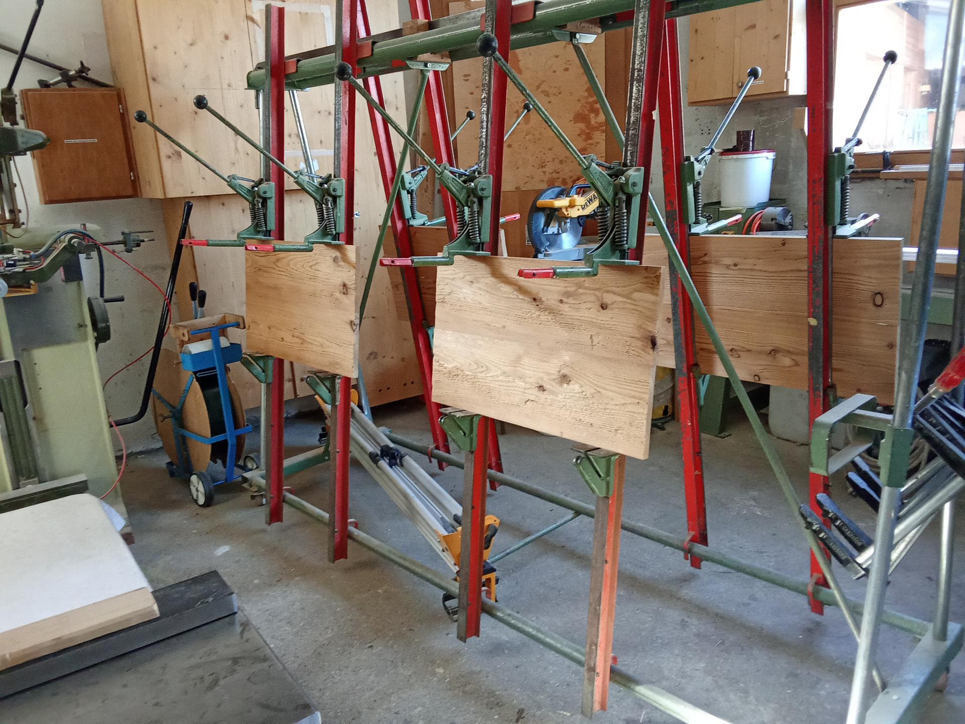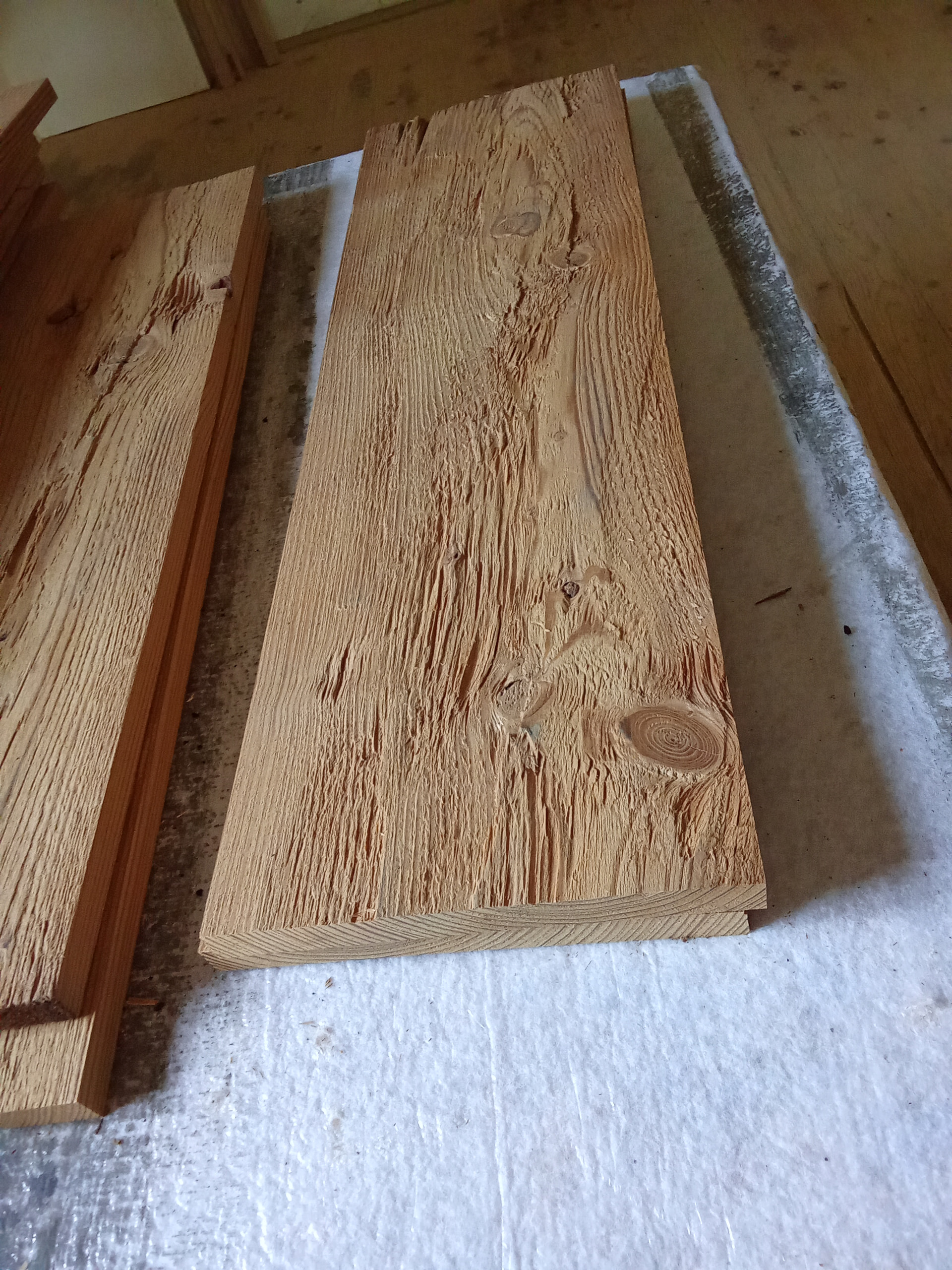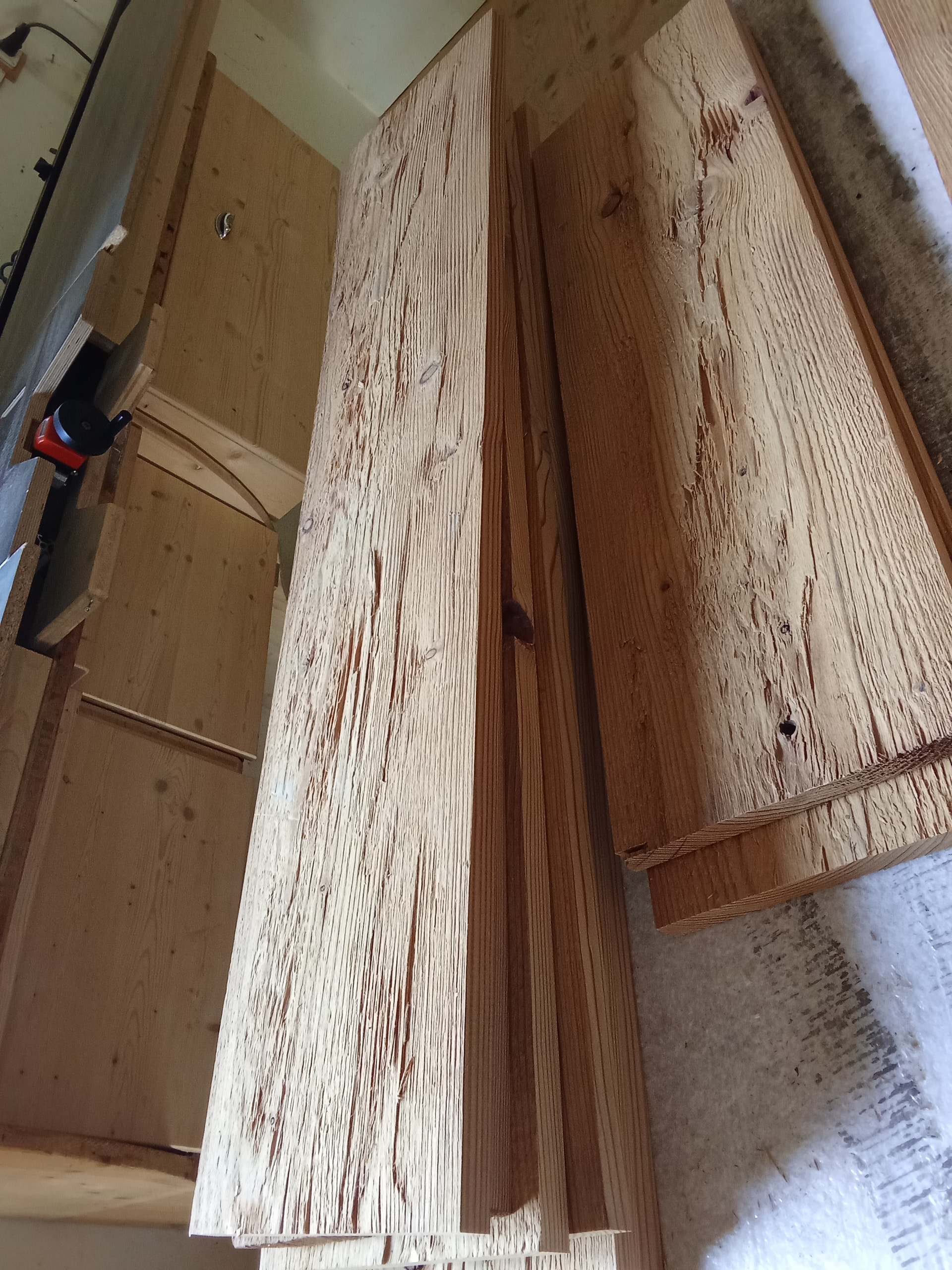 Preparando unos estantes de meleze termo tratado , con acabado al hacha