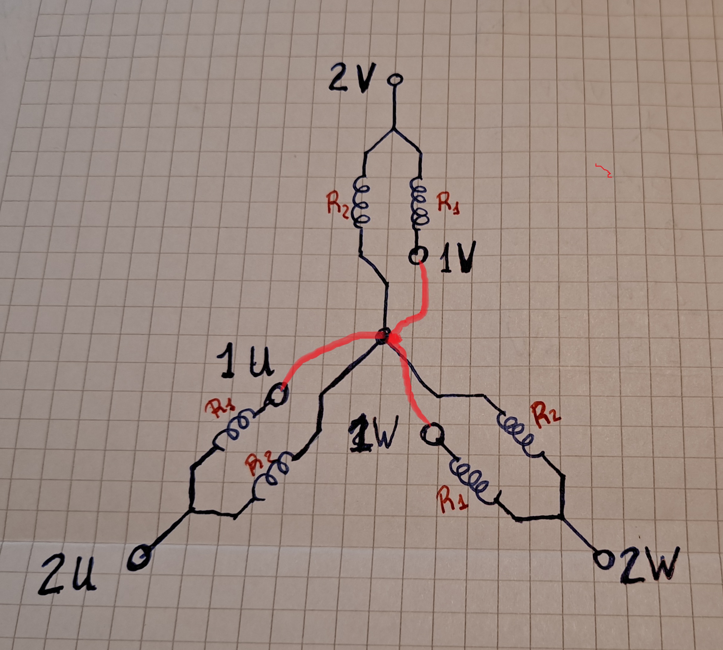 Lo he dibujado con la nomenclatura de tus esquemas para que esté más claro y he dado nombre a los valores de resistencias de las bobinas. En principio siendo un Dahlander, R1 debería ser igual a R2 pero a veces aparecen “cosas raras”, por eso lo he puesto más genérico.