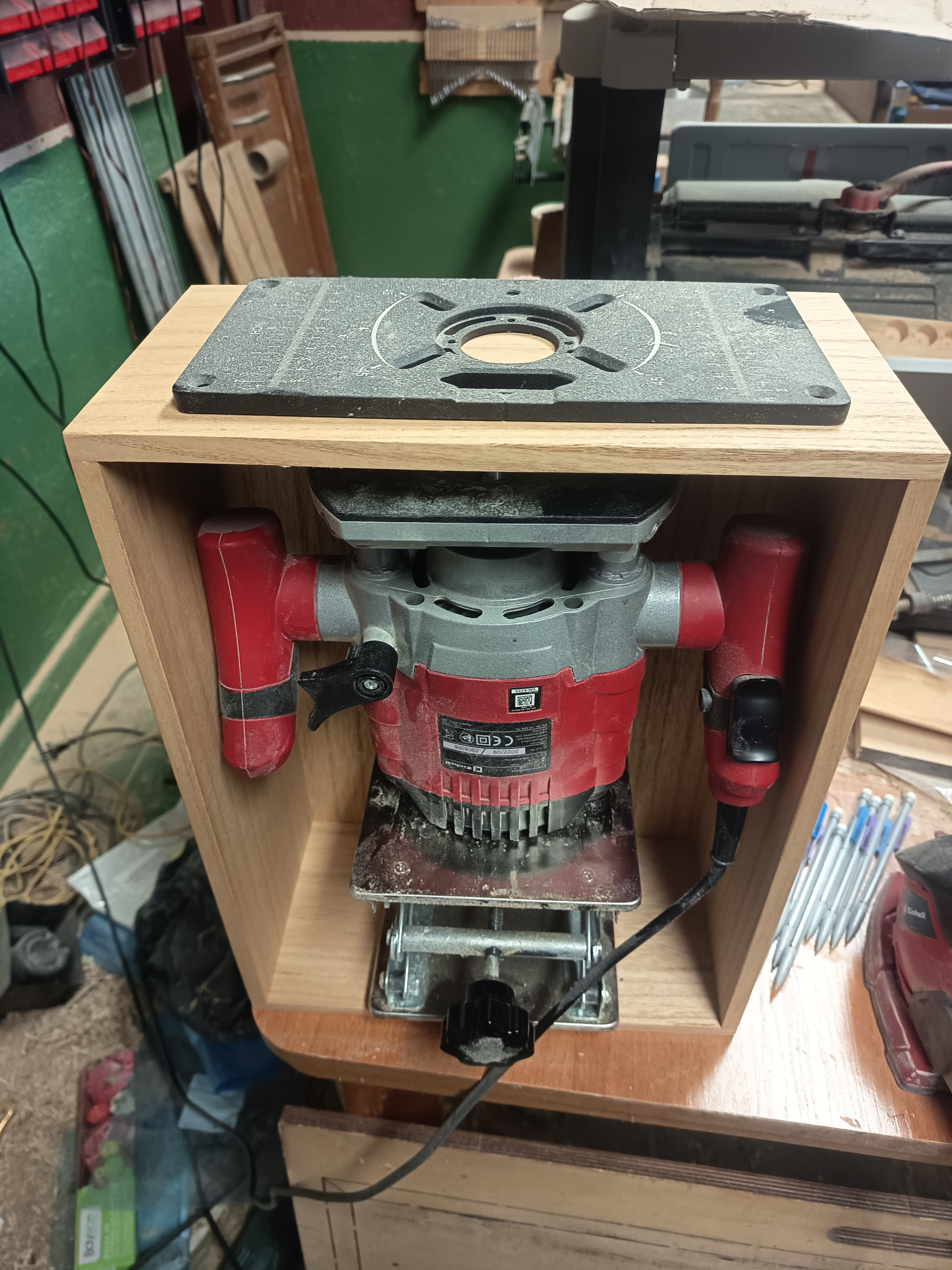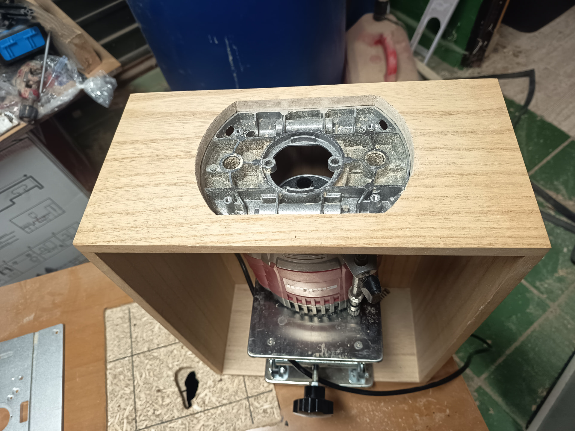 El tema de las alturas lo estoy solucionando, lo estaba enfocando mal, la zapata o base de la fresadora ha de ser pasante en relación al cajon y también al tablero porque solo ha de ir atornillada a la placa y me van bien cualquiera de las dos que tengo pero voy a utilizar la más grande de las dos que además, es más estrecha pero consistente, así en el cajón habrá un abujero justo para pasar la zapata, en el tablero otro igual que el del cajón y en la parte superior del tablero he de hacer la hendidura para que el inserto quede enrasado con el tablero, luego fijar el cajón al tablero y la base de la fresadora al inserto, creo que es la única fórmula posible para conseguir lo que pretendo, de momento he empezado con el cajón, falta afinar un poco y lo tengo: