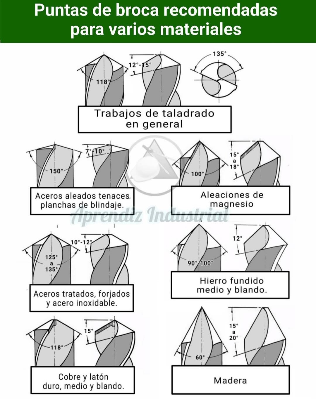 Las brocas se afilan con diferentes ángulos según el material que se perfore,