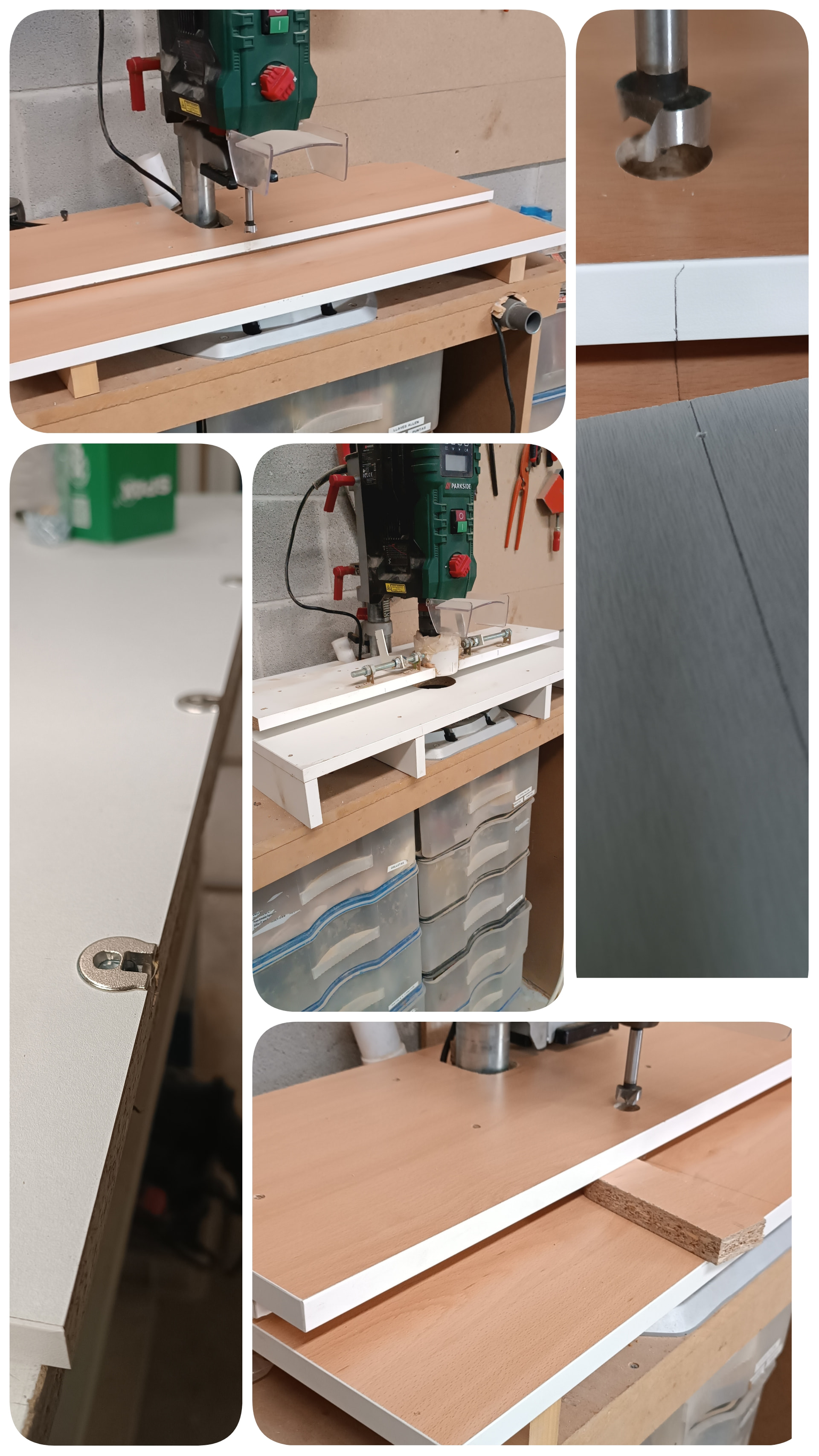 Pues tenia que hacer un mueble y me venia mejor por el montaje unas excentricas tipo soportaestante, y ayer un par de horas y hoy otra hora, me he hecho lo mismo pero a medida para taladrar los 20mm de la excentrica, centro a 9.5mm del borde, y con una linea de lapiz que te marca el centro, pendiente de hacer un sistema de topes.