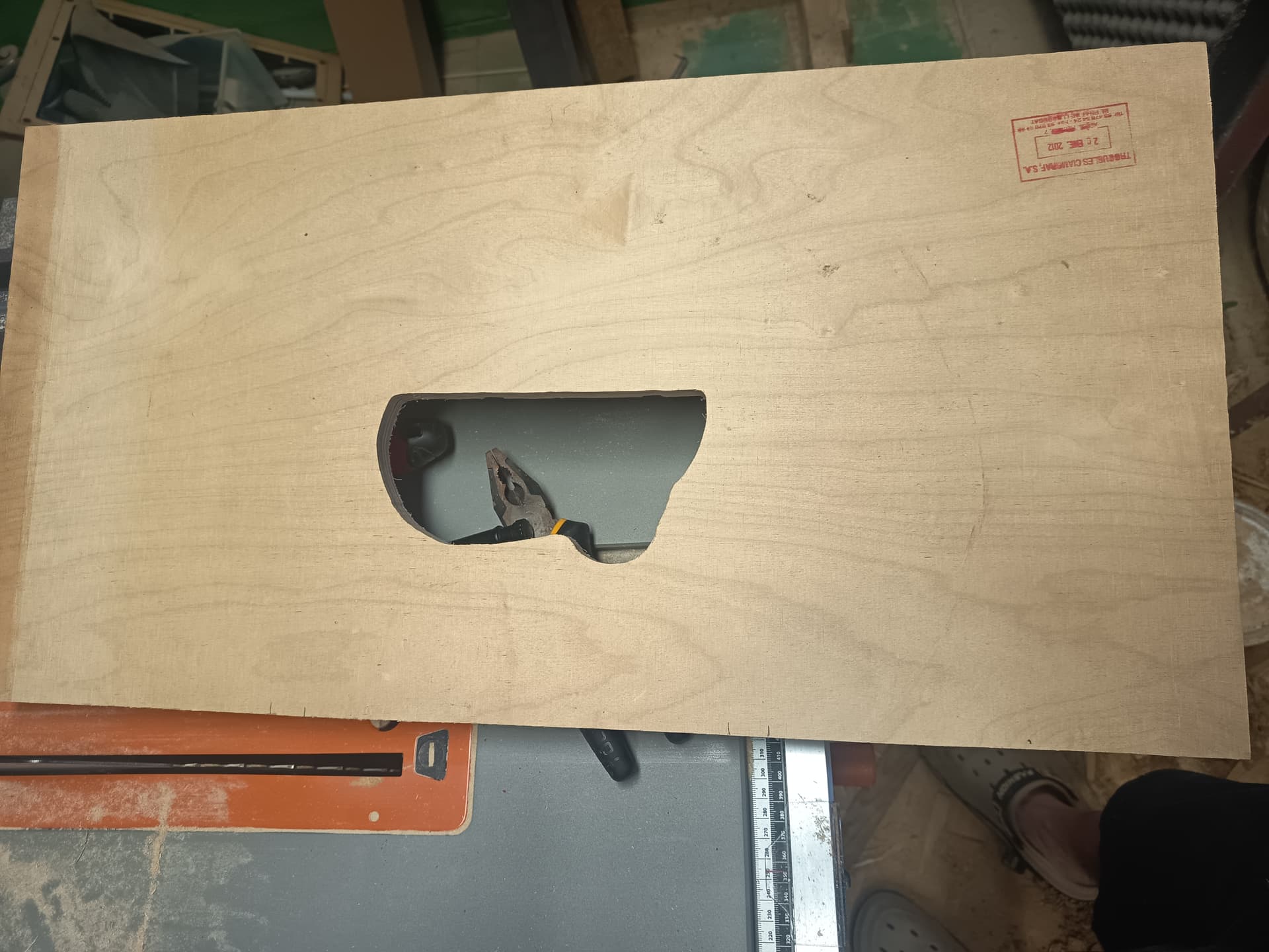 Una vez dibujada la forma de la proteccion habia pensado a ver con que la corto, con la sierra de calar invertida que tengo podria pero he de modificarla porque las maderas que hacen de soporte del centrador me limitan las medidas de lo que vaya a cortar, asi que descartado, tambien pense en la sierra de calar de mano, se que puede salir medio bien pero opte por la fresadora en un inserto que la tengo puesta provisional atornillada a un tablero, una fresa recta de 8mm y pulso y paciencia, ha quedado bastante bien contando que tenia que haber ubicado la fresadora en un lugar plano y no lo es porque era un sobre encolado que con el sol se ha desencolado y unos listones estan mas altos que otros y no podia girar bien el tablero pero me apañé (otra cosa pendiente, para cosas provisionales hacerme con un sobre que este medianamente bien como base).