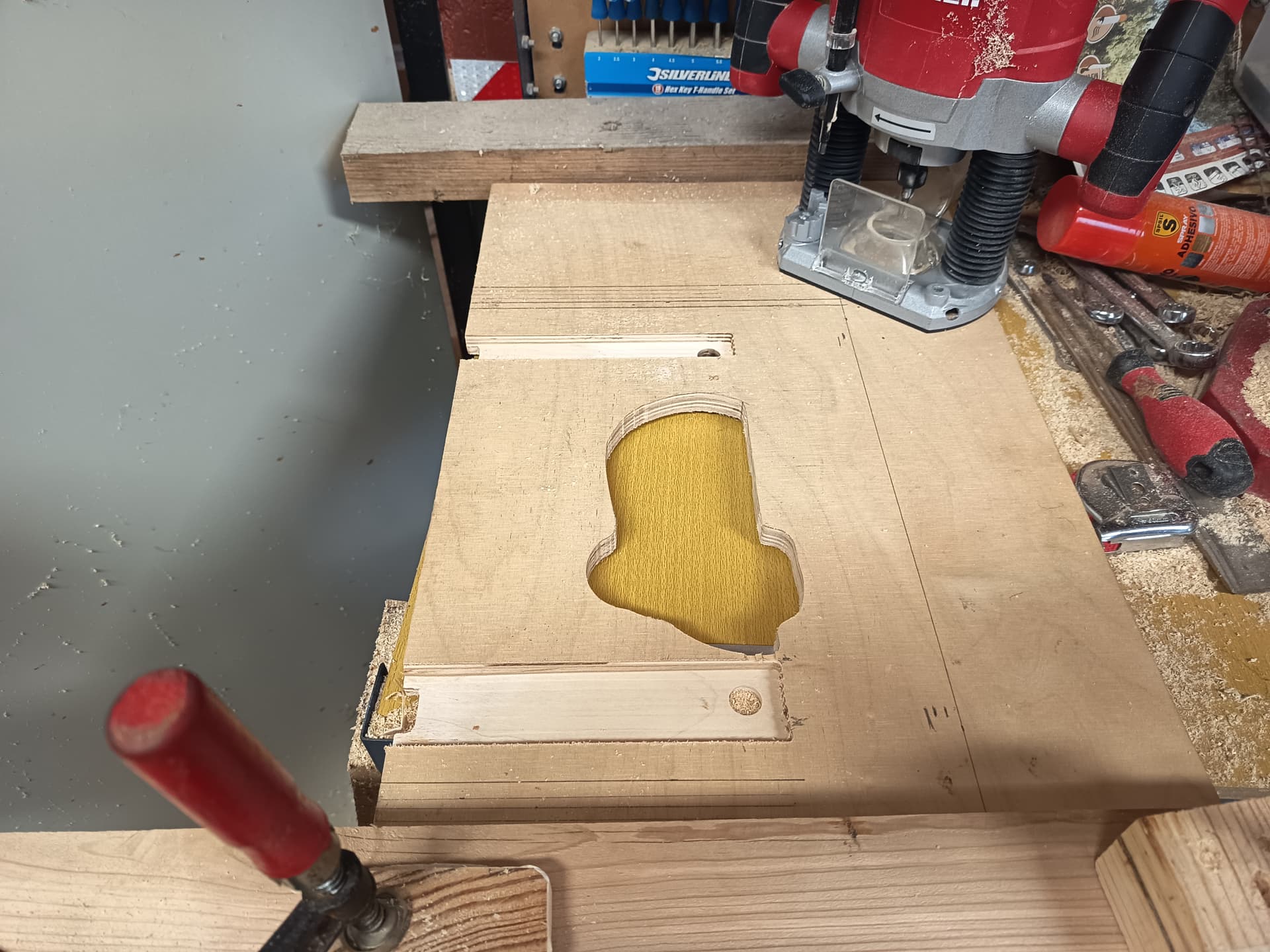 No pense en hacer foto al sistema que empleé para fresar la forma pero para que os hagais una idea es algo asi como en esta foto que tomé para otra cosa, quitandole la barrera y con una fresa recta, esa que se ve en la foto es para redondear cantos.