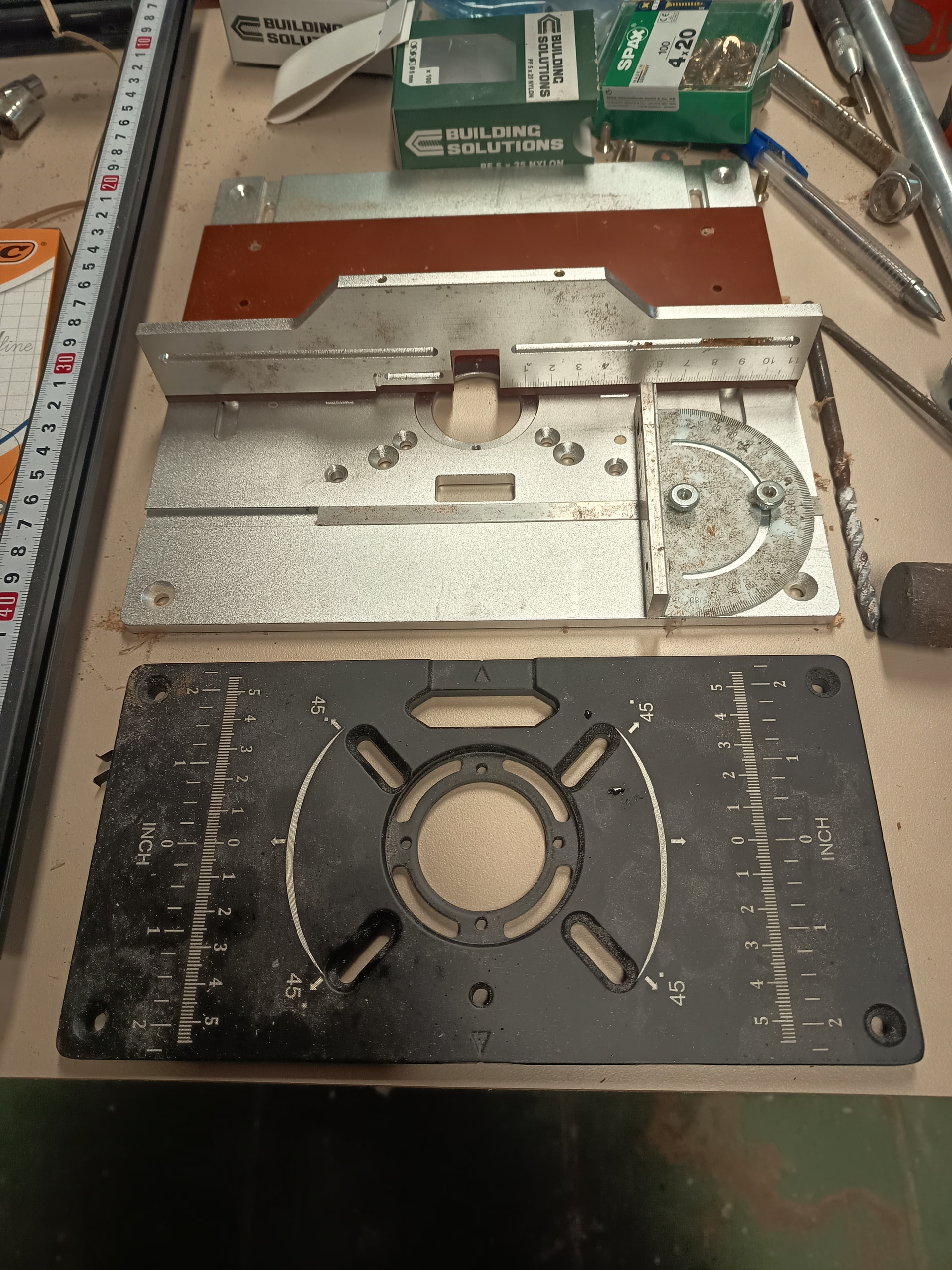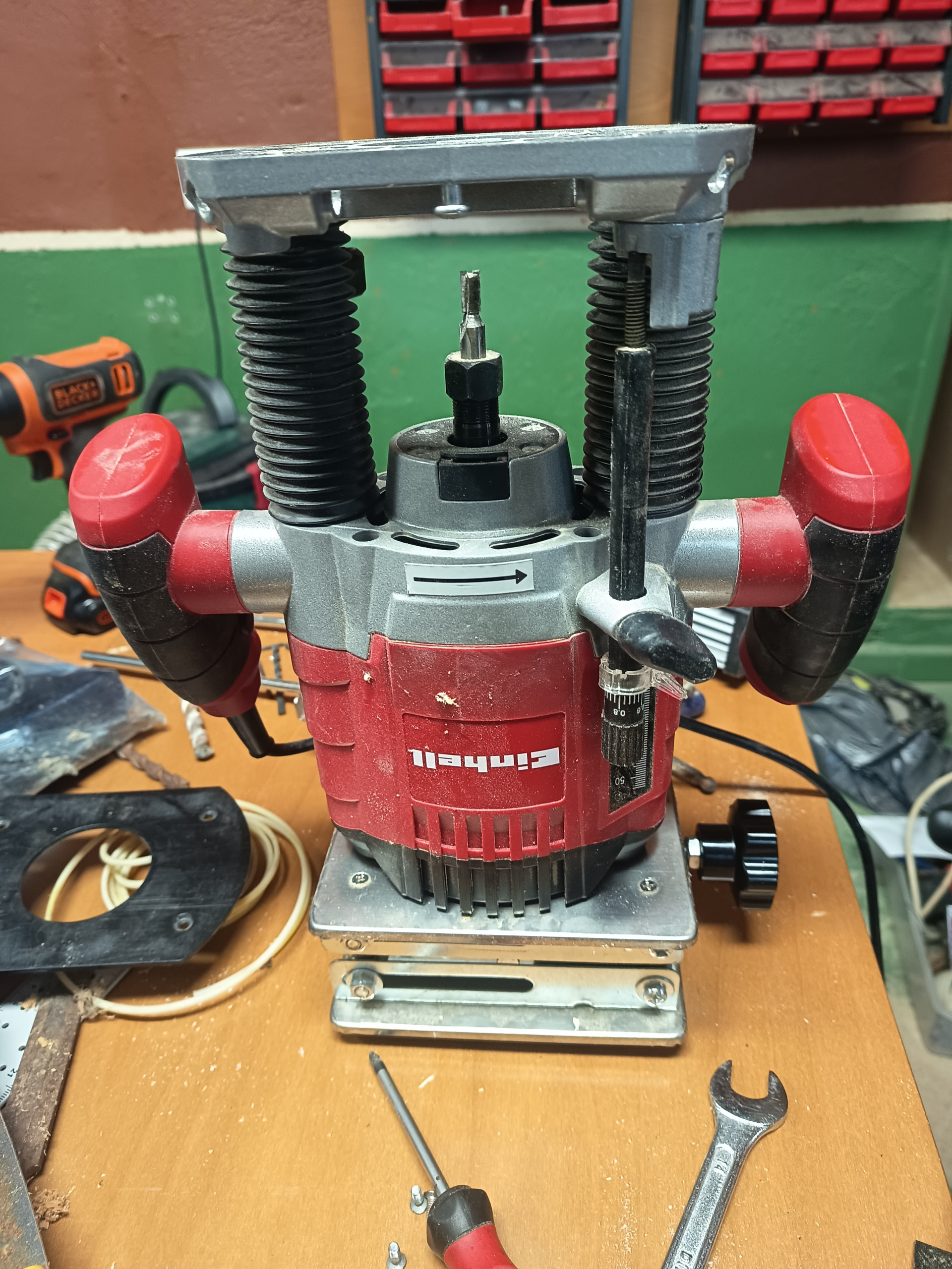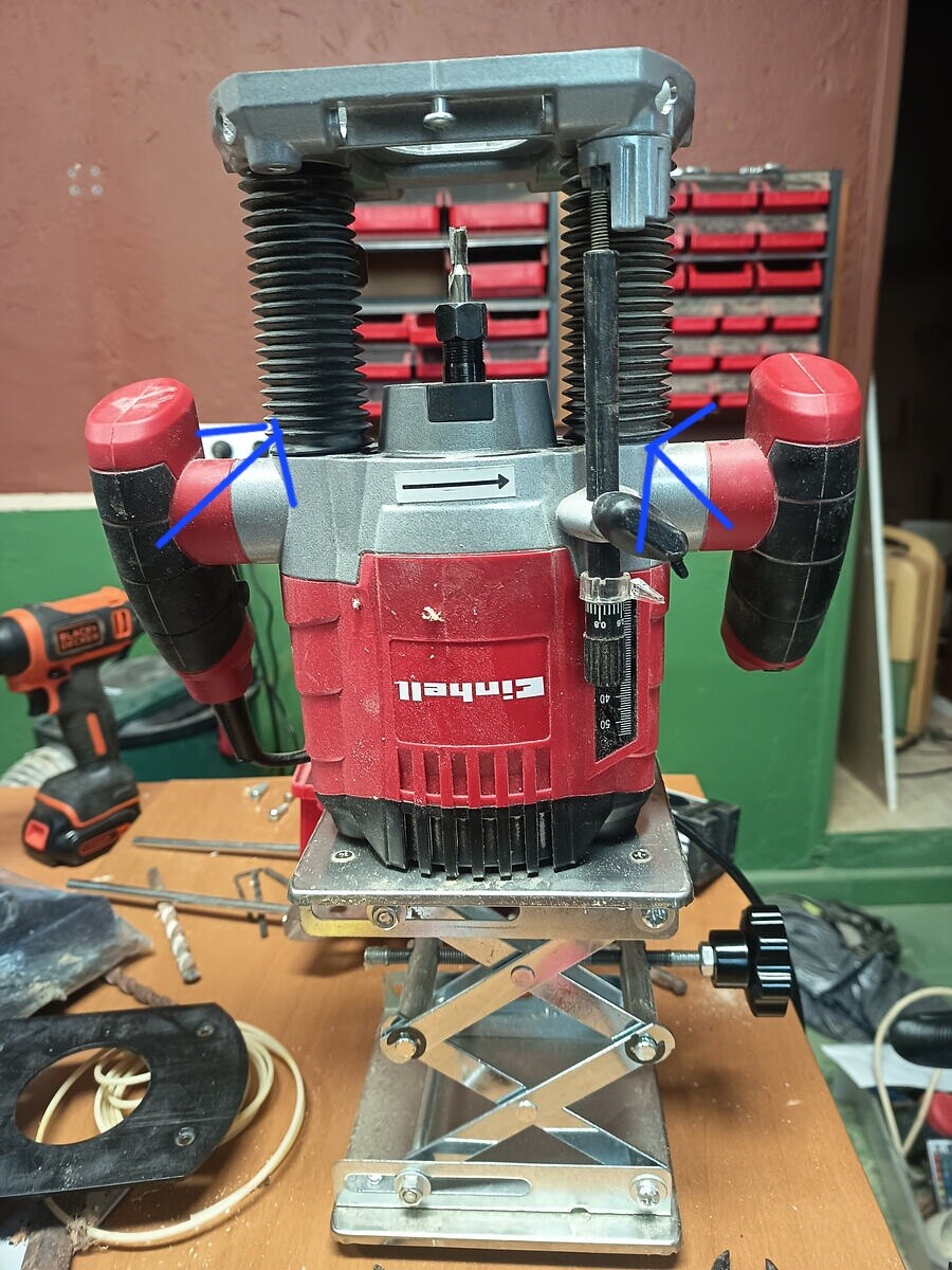 Buenas, ya me están llegando algunas piezas del trineo de la fresadora y más adelante he de hacer unos rebajes para colocar una placa inserto para una fresadora invertida, mi modelo en concreto es la Einhell TE-RO 1155 E y estaba mirando de sacarle los muelles para que suba y baje con más facilidad sin forzar el tablero (utilizare una mini plataforma elevable que compre en AliExpress hace unos meses para subir o bajar la fresadora), el caso es que no veo el modo de poder desmontar la placa base para poder sacar los muelles y por mucho que miro en Google no veo el modo, por si alguien puede resolverme está duda, gracias por adelantado, aprovecho y comparto foto de la plataforma que comentaba:
