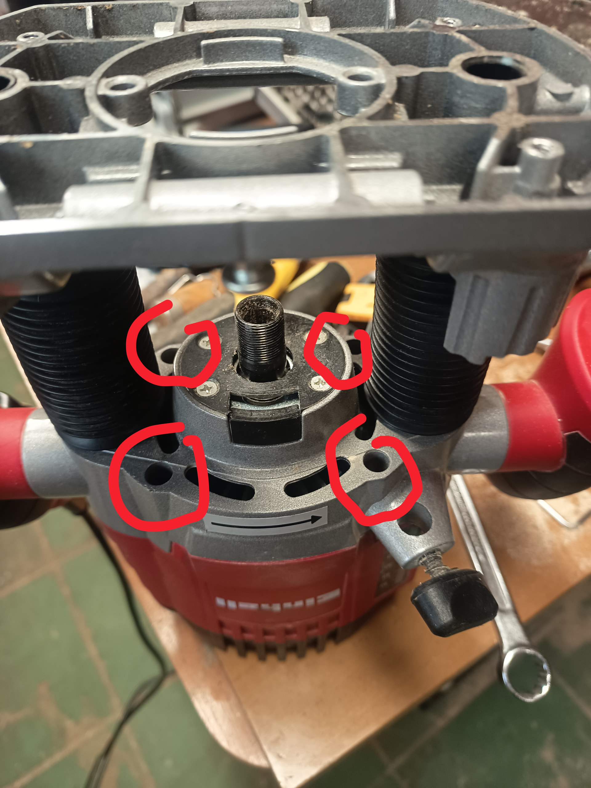 Primero he subido la fresadora a tope y he sacado los 4 tornillos que cogen la carcasa con un destornillador corto de estrella