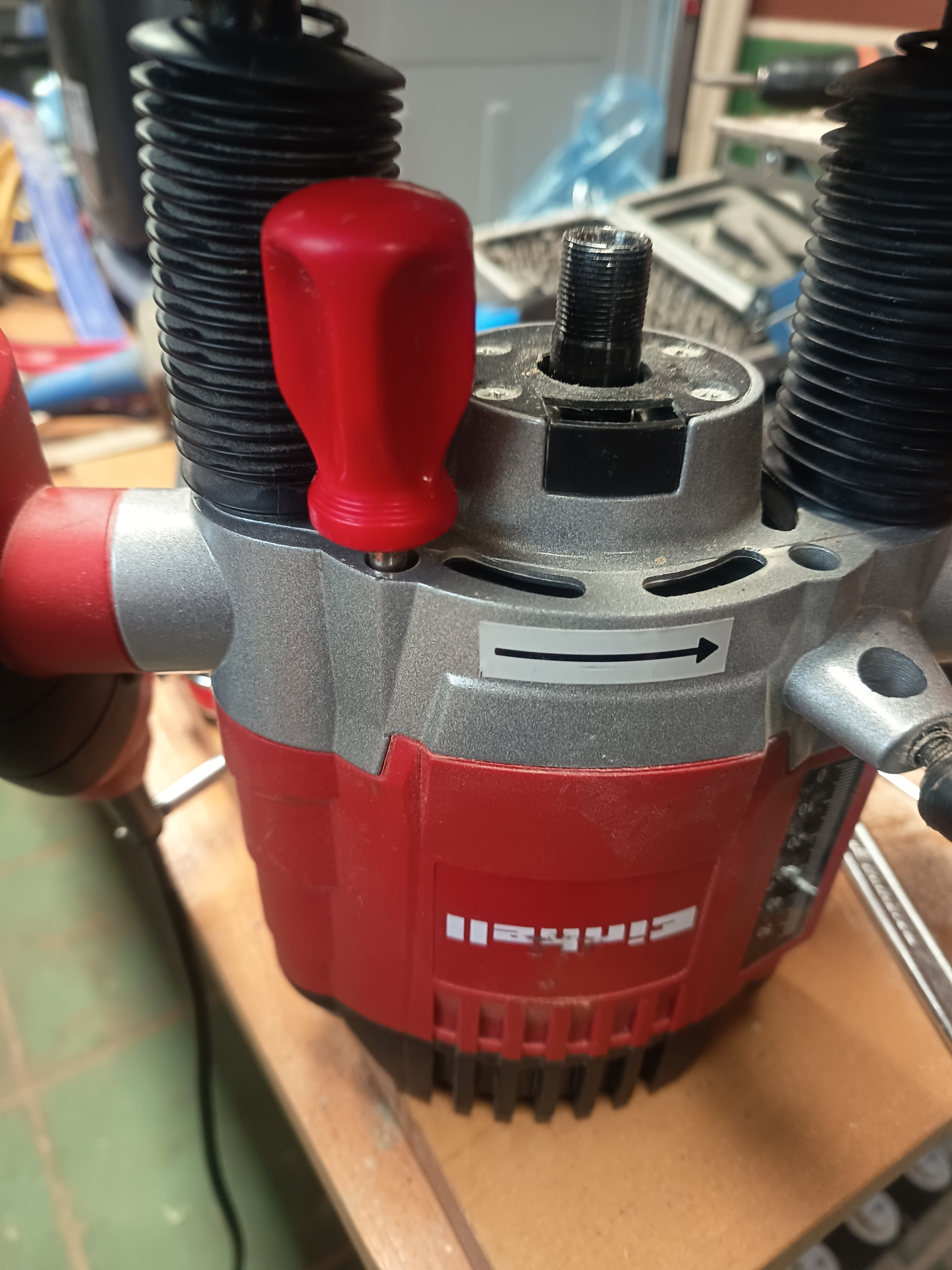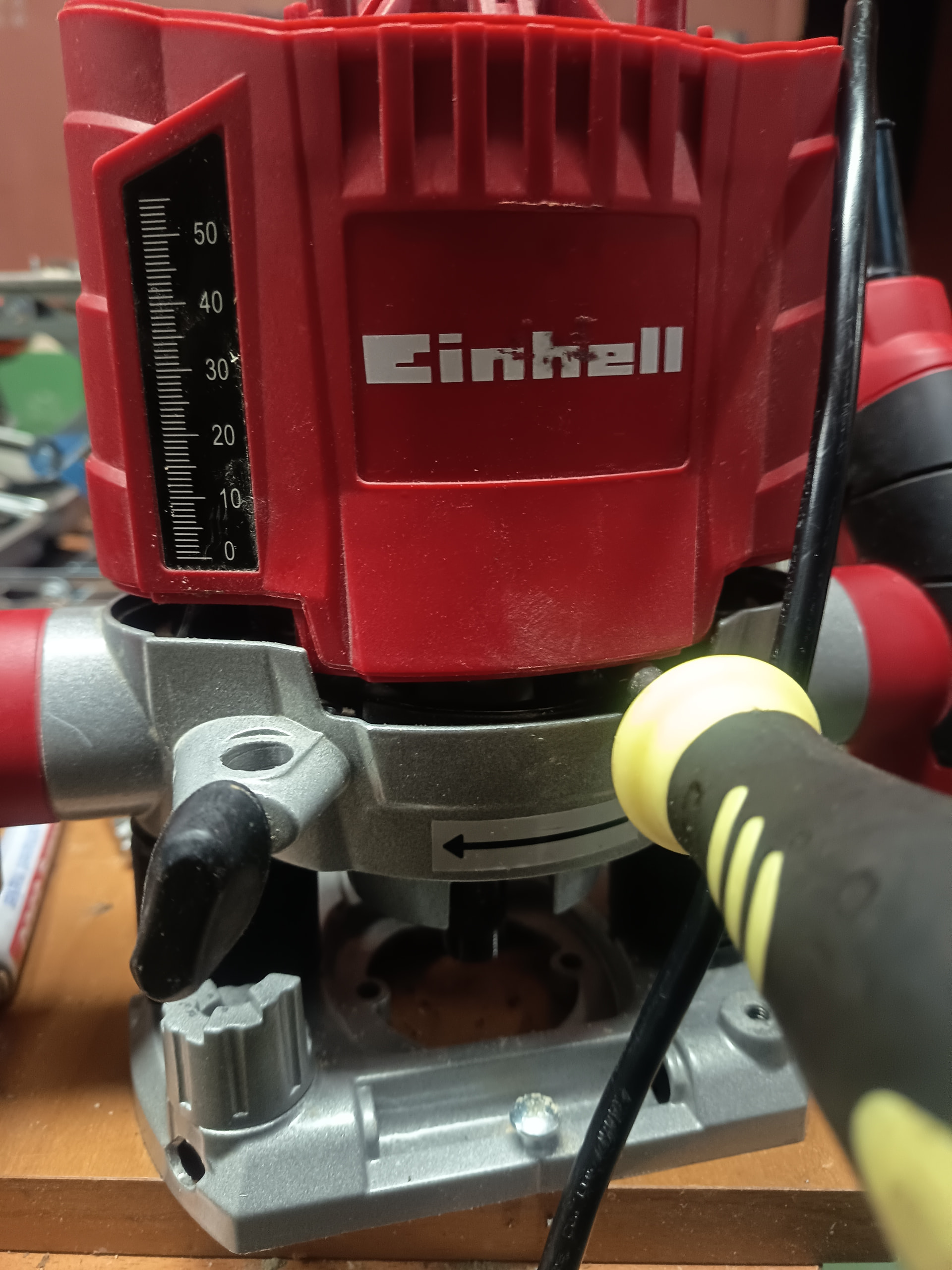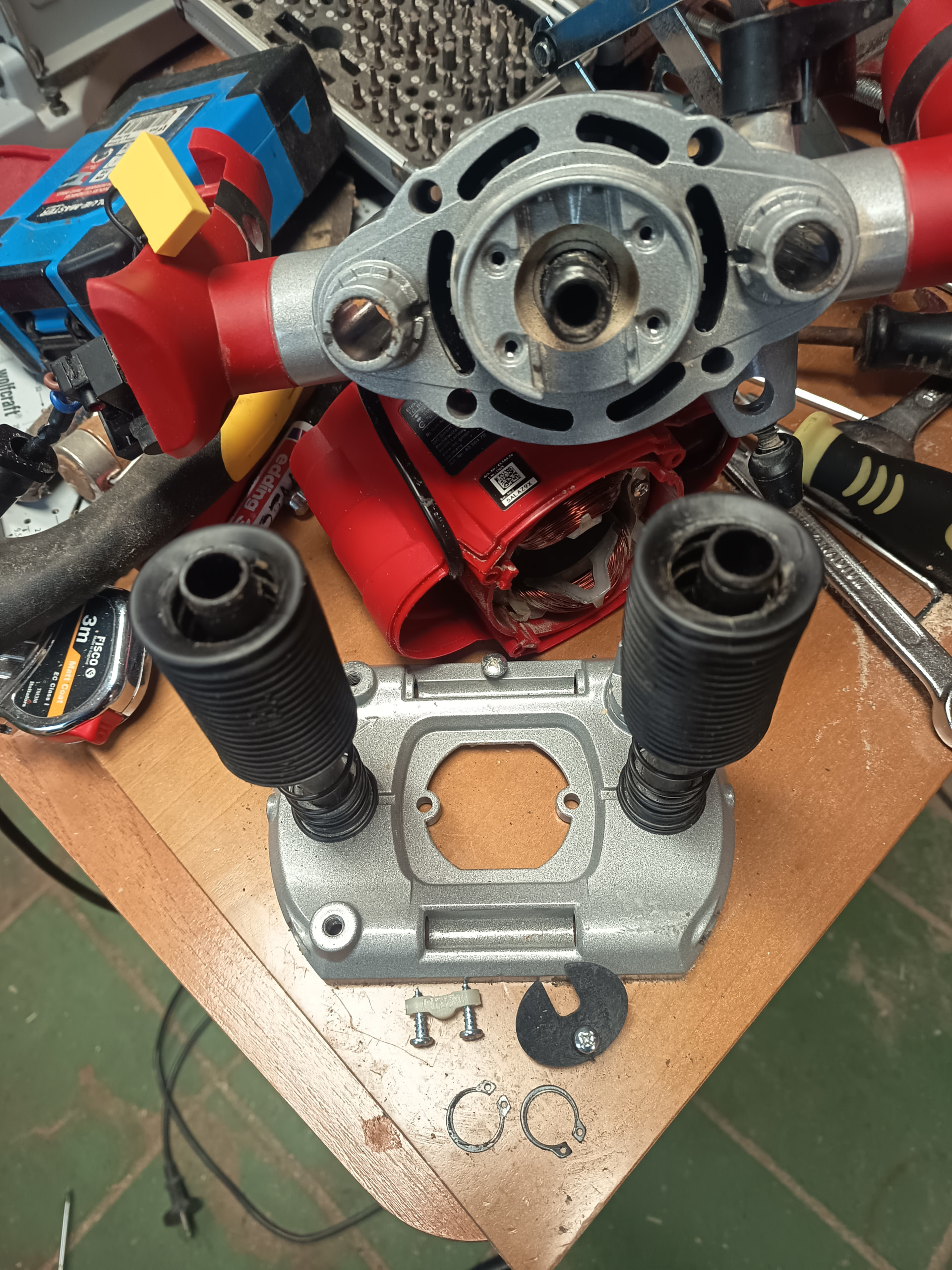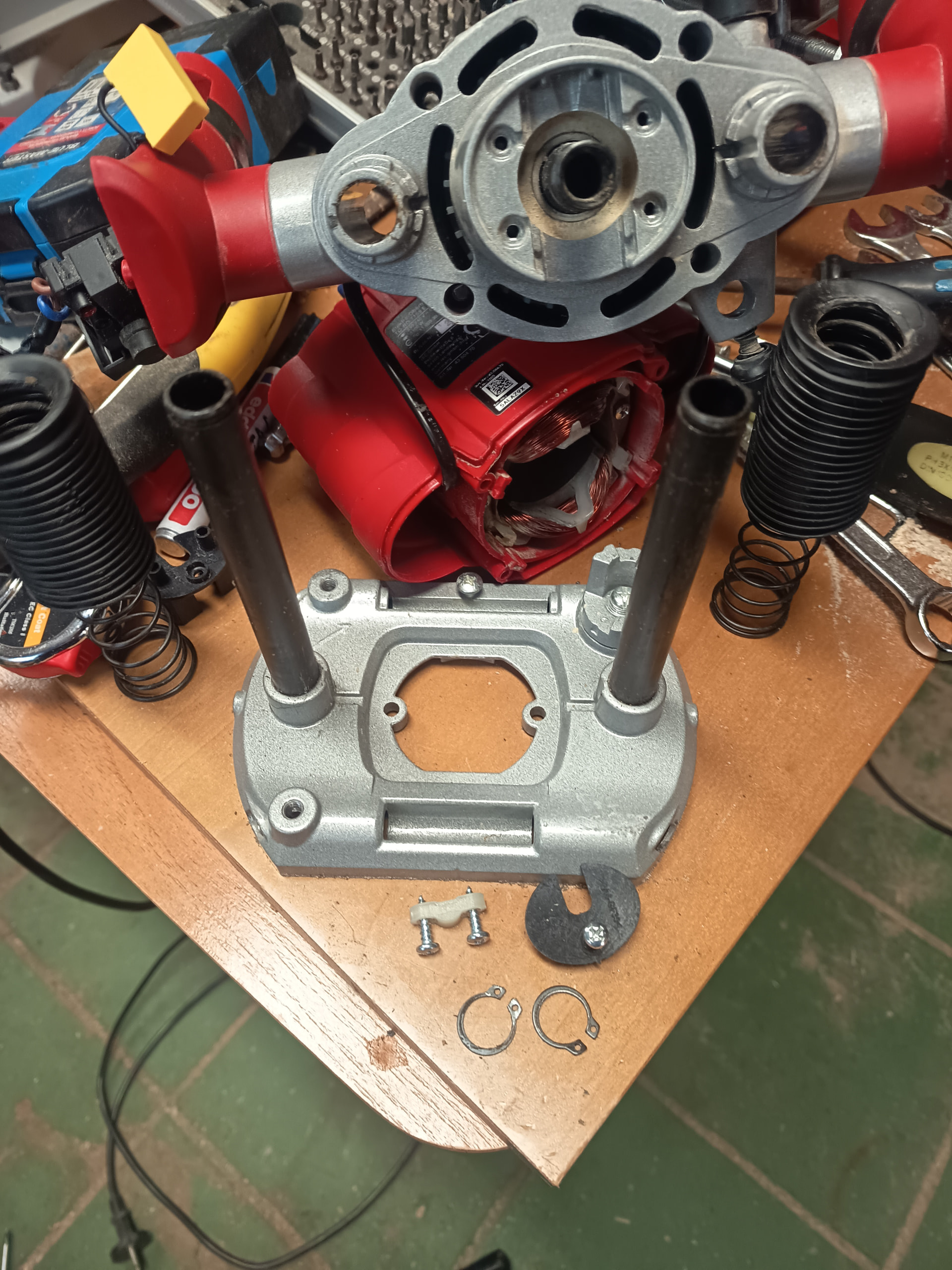 Edito para añadir: No hay ni un solo video en la red para poder ver como desarmar la base de la fresadora Einhell salvo uno que he visto que tenía otro fin pero me ha dado otra idea, desmontar el bloque metálico que sujeta la carcasa para que queden a la vista los ejes por el otro extremo, quitarle las anillas de presión y sacarlos por ese extremo en lugar de hacerlo por abajo, voy a probar ese camino y comento