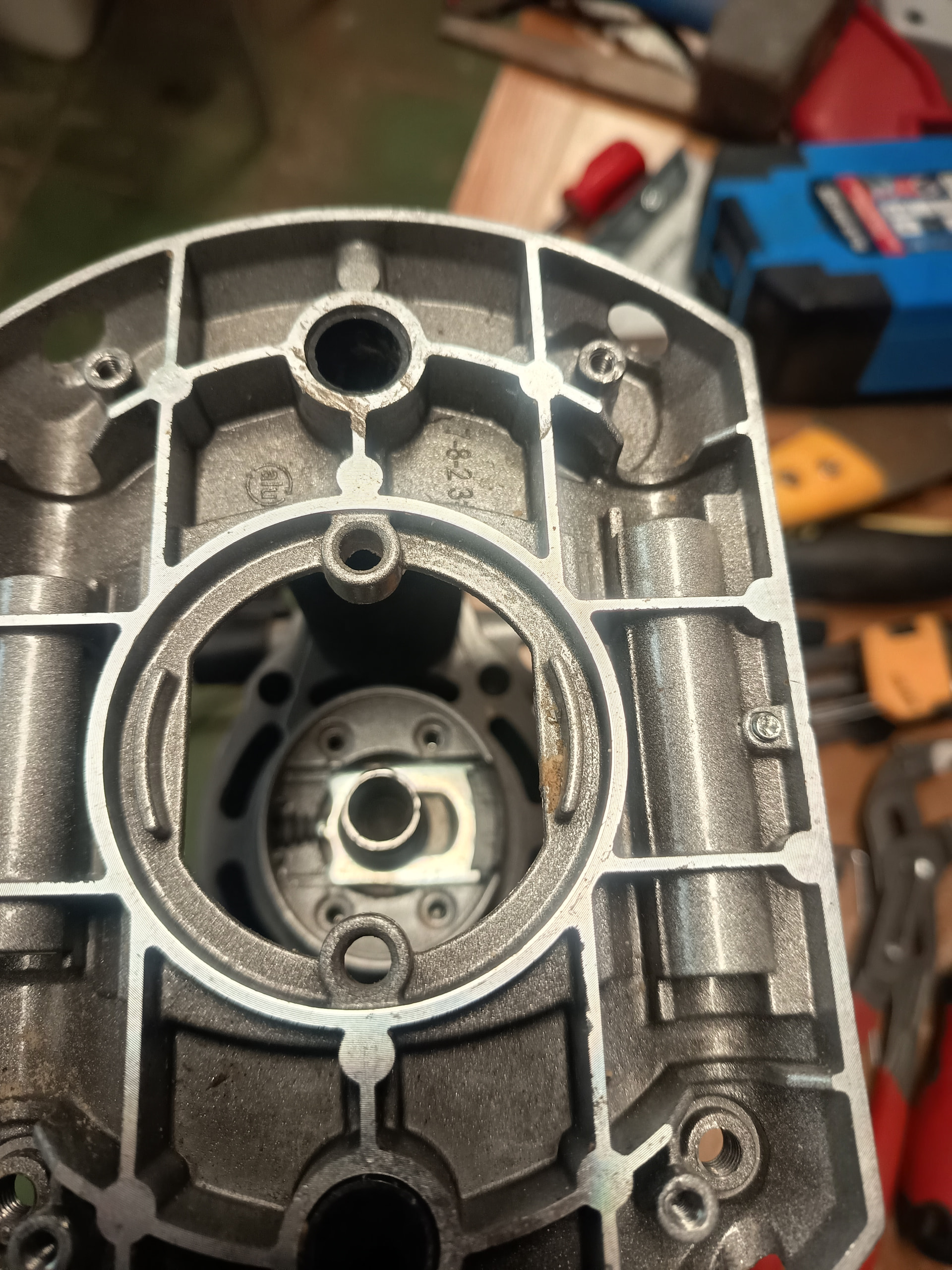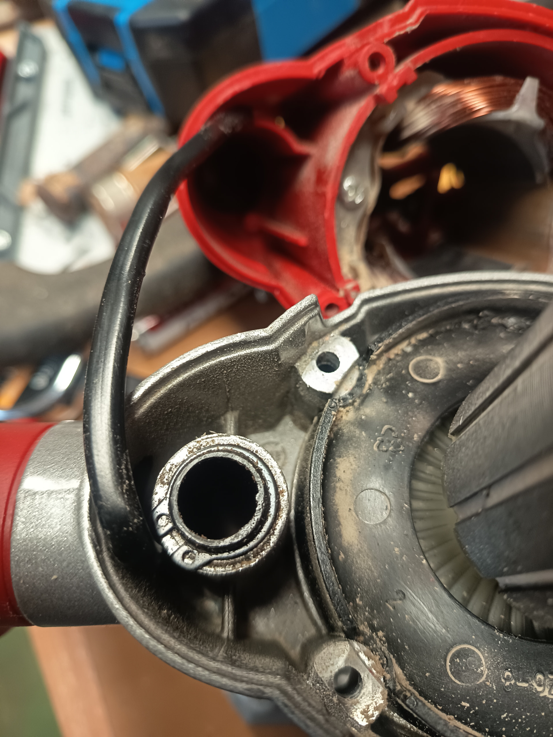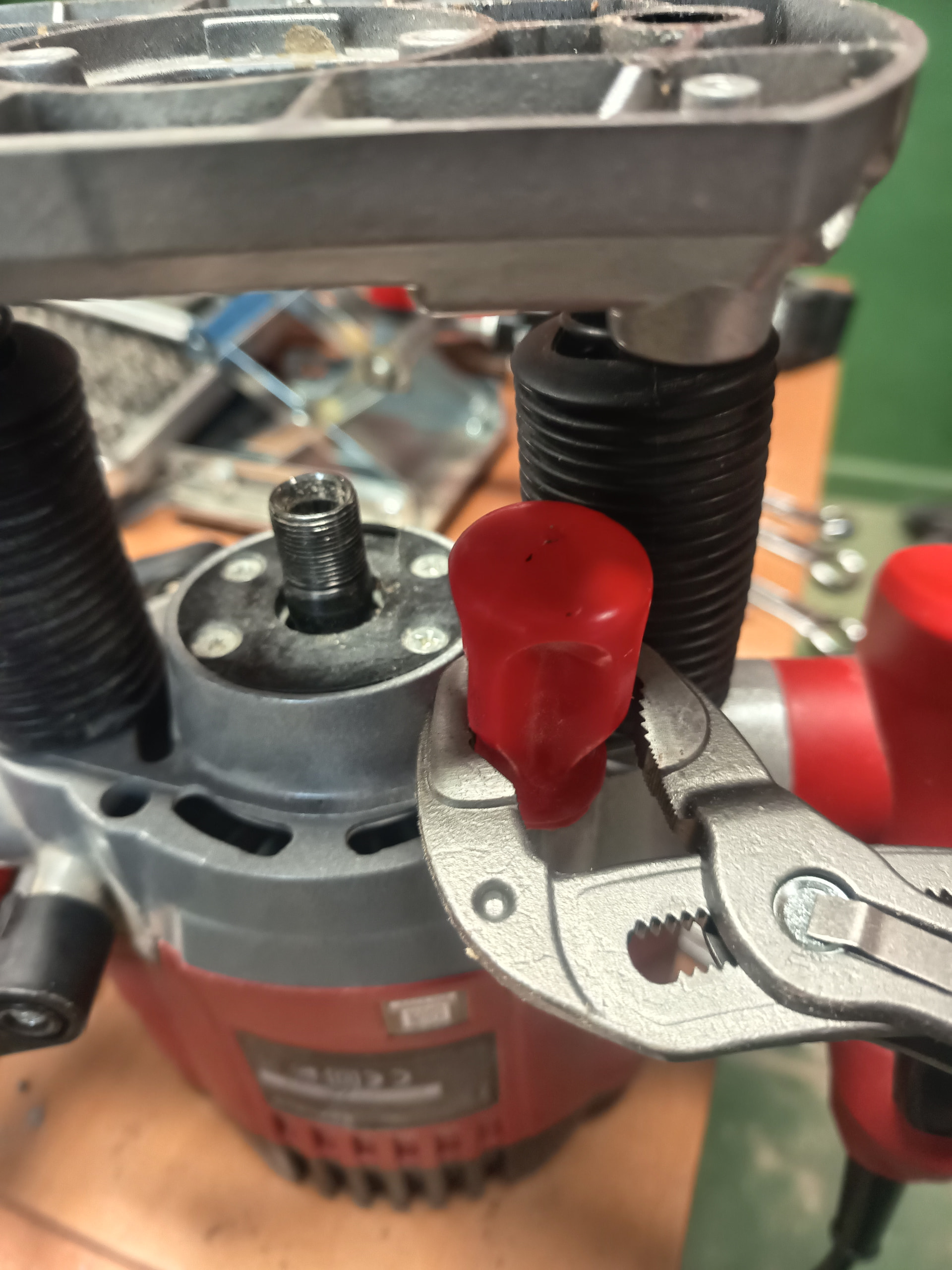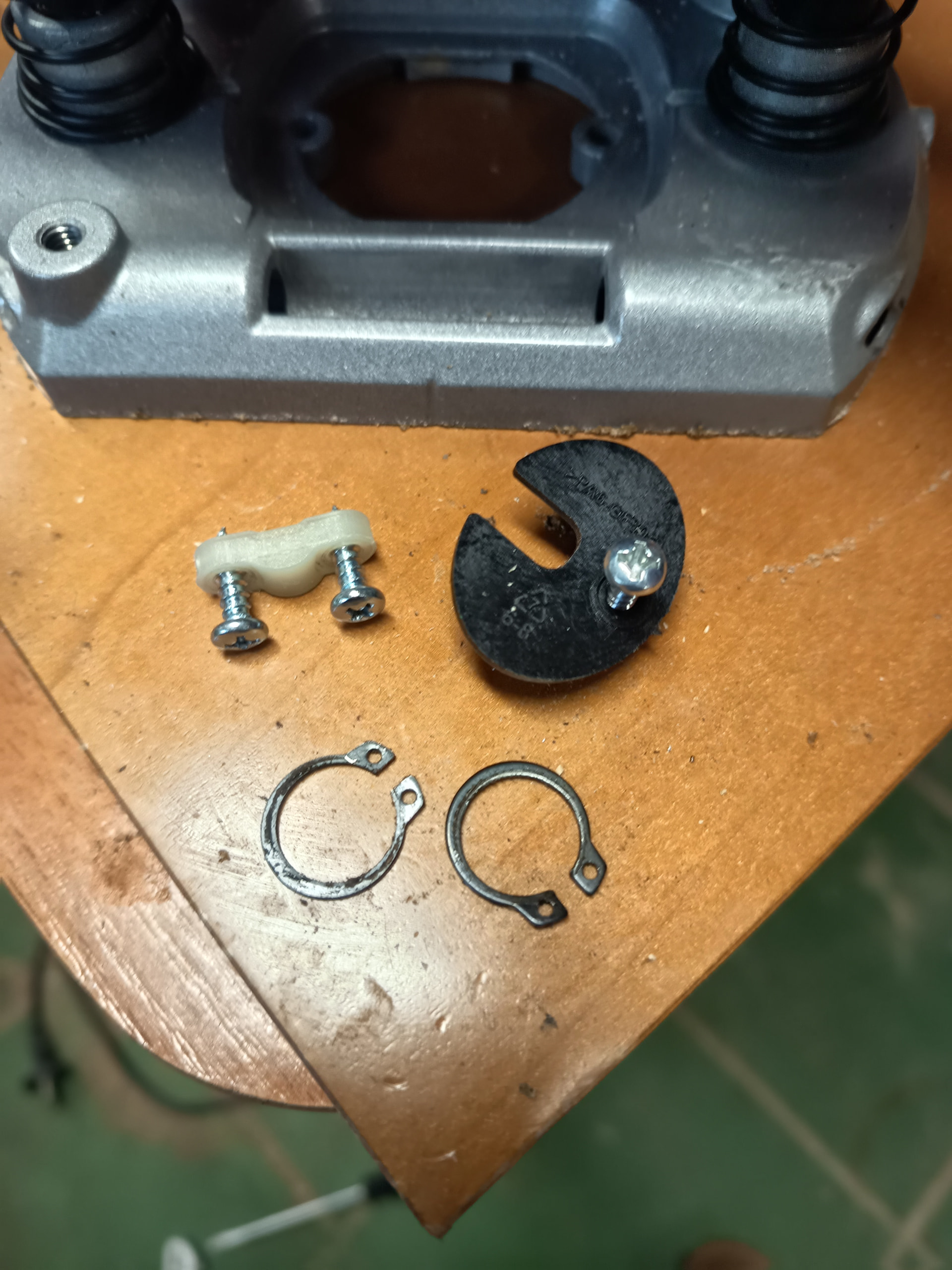 Edito para añadir: No hay ni un solo video en la red para poder ver como desarmar la base de la fresadora Einhell salvo uno que he visto que tenía otro fin pero me ha dado otra idea, desmontar el bloque metálico que sujeta la carcasa para que queden a la vista los ejes por el otro extremo, quitarle las anillas de presión y sacarlos por ese extremo en lugar de hacerlo por abajo, voy a probar ese camino y comento