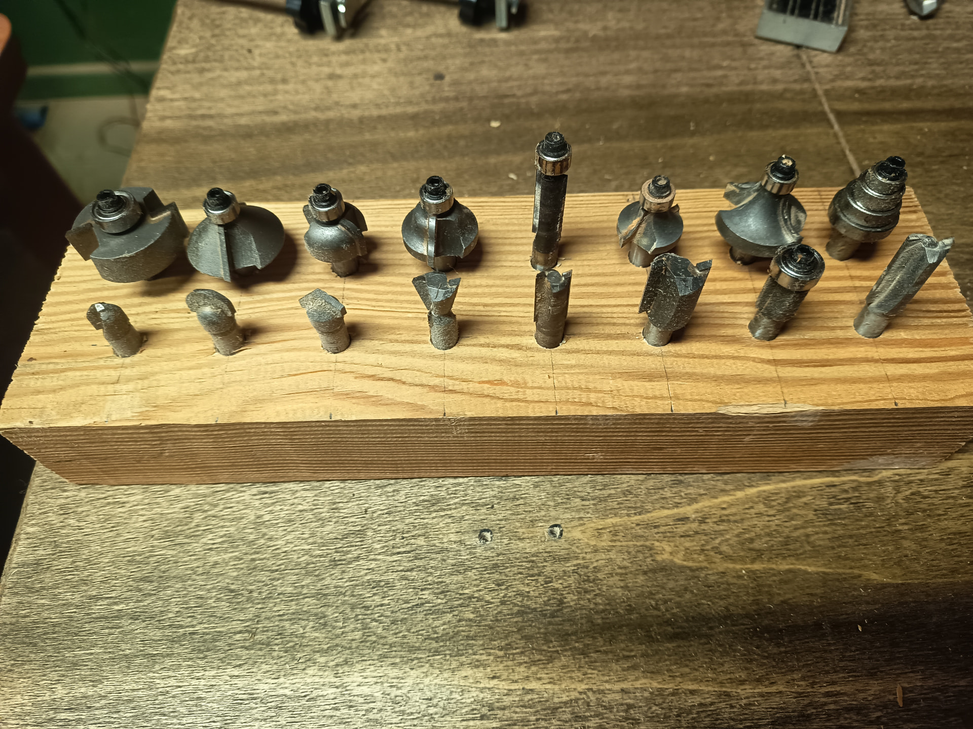 A mi no me gusta meter las fresas en la madera. Es facil que se oxide el mango de la fresa con el tiempo por la humedad que absorbe la madera. Prefiero dejarlas en su cajita de plastico.