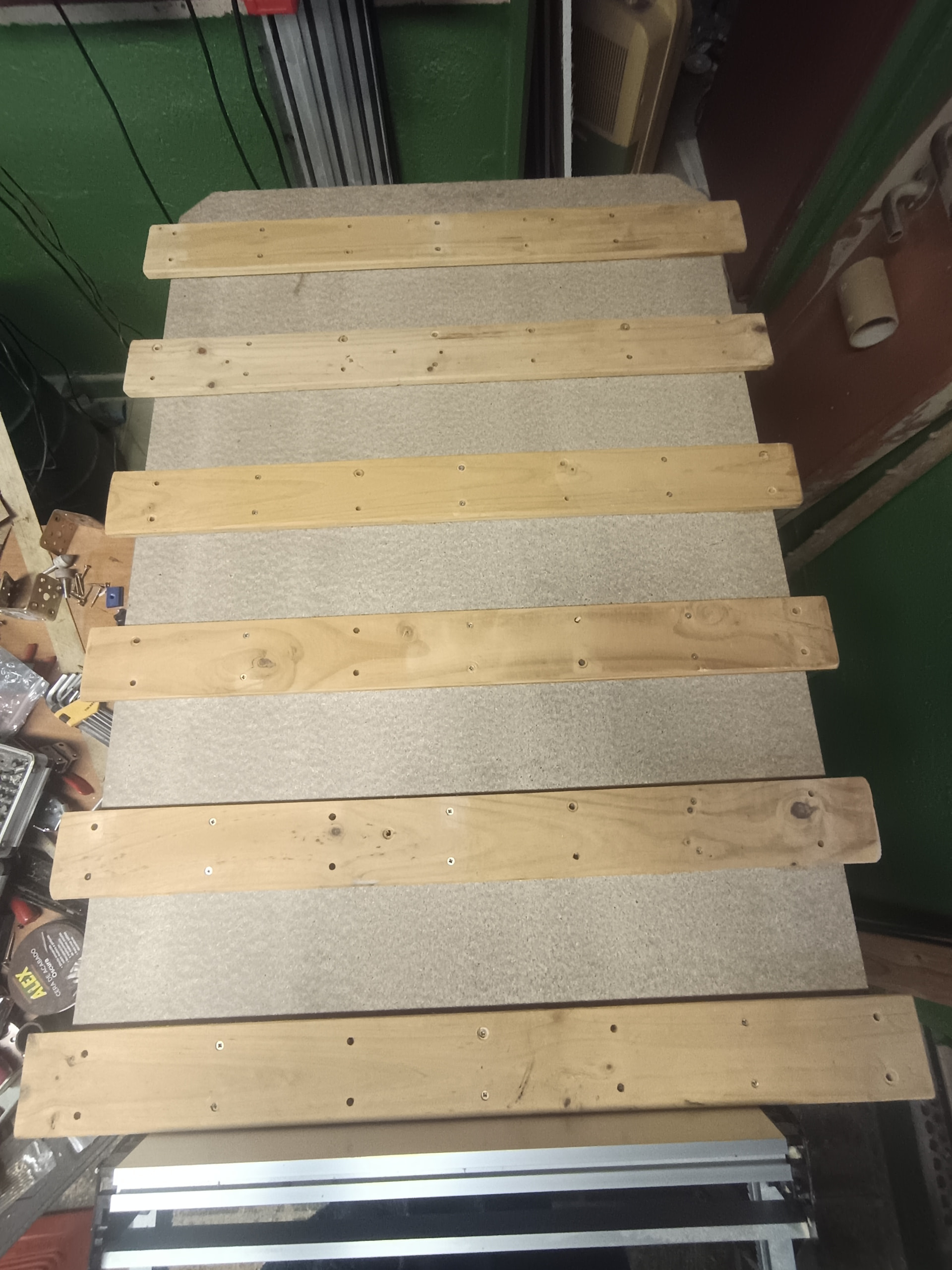 Para las dos barreras he utilizado un retal de larguero de pérgola, creo que de pino norte, con un espesor final después de pasarlo por la regruesadora, de 80mm x 35mm, la longitud de la barrera delantera es de 343 y la longitud de la barrera trasera es de 657, igual que el ancho de la plataforma.