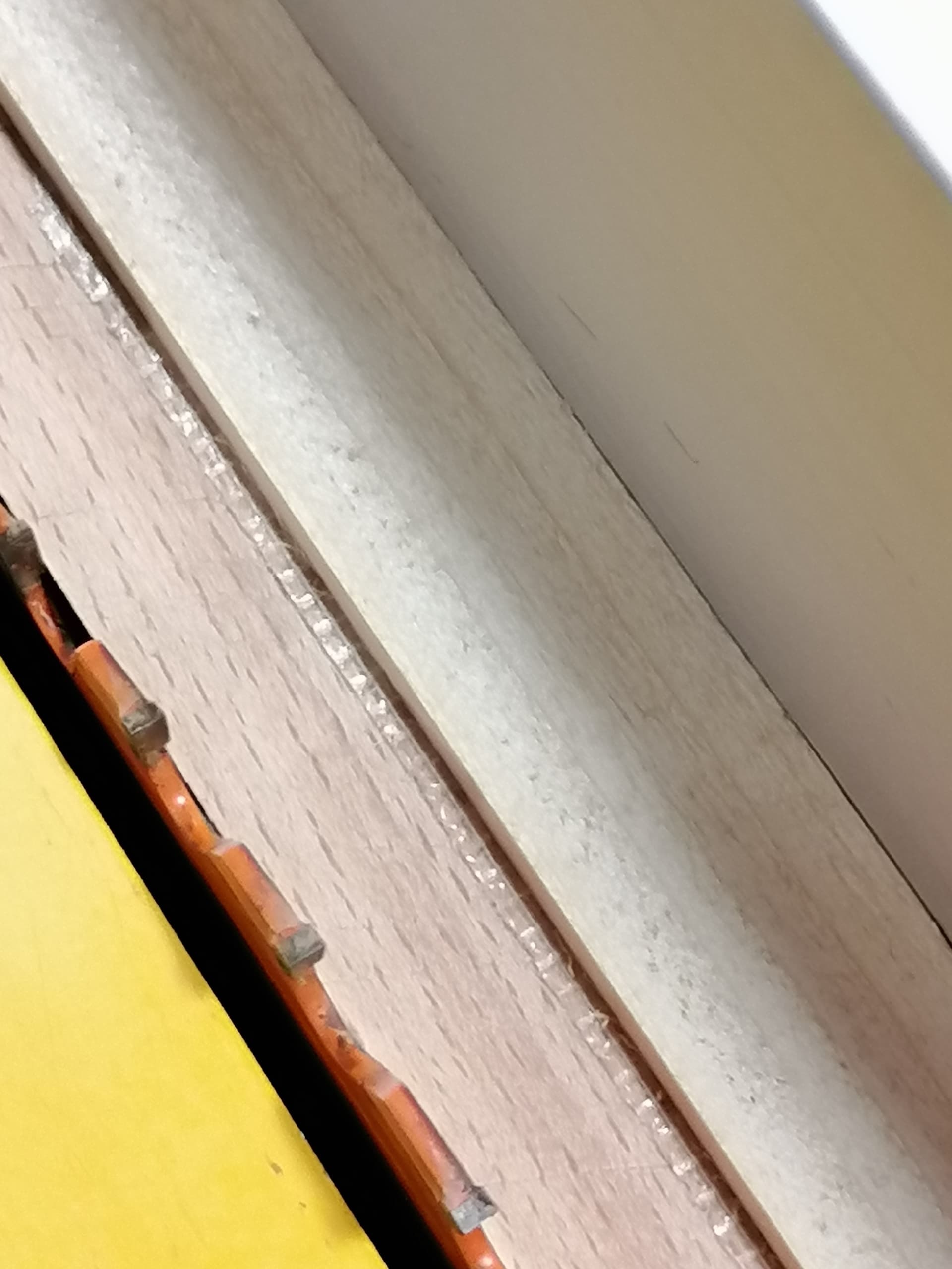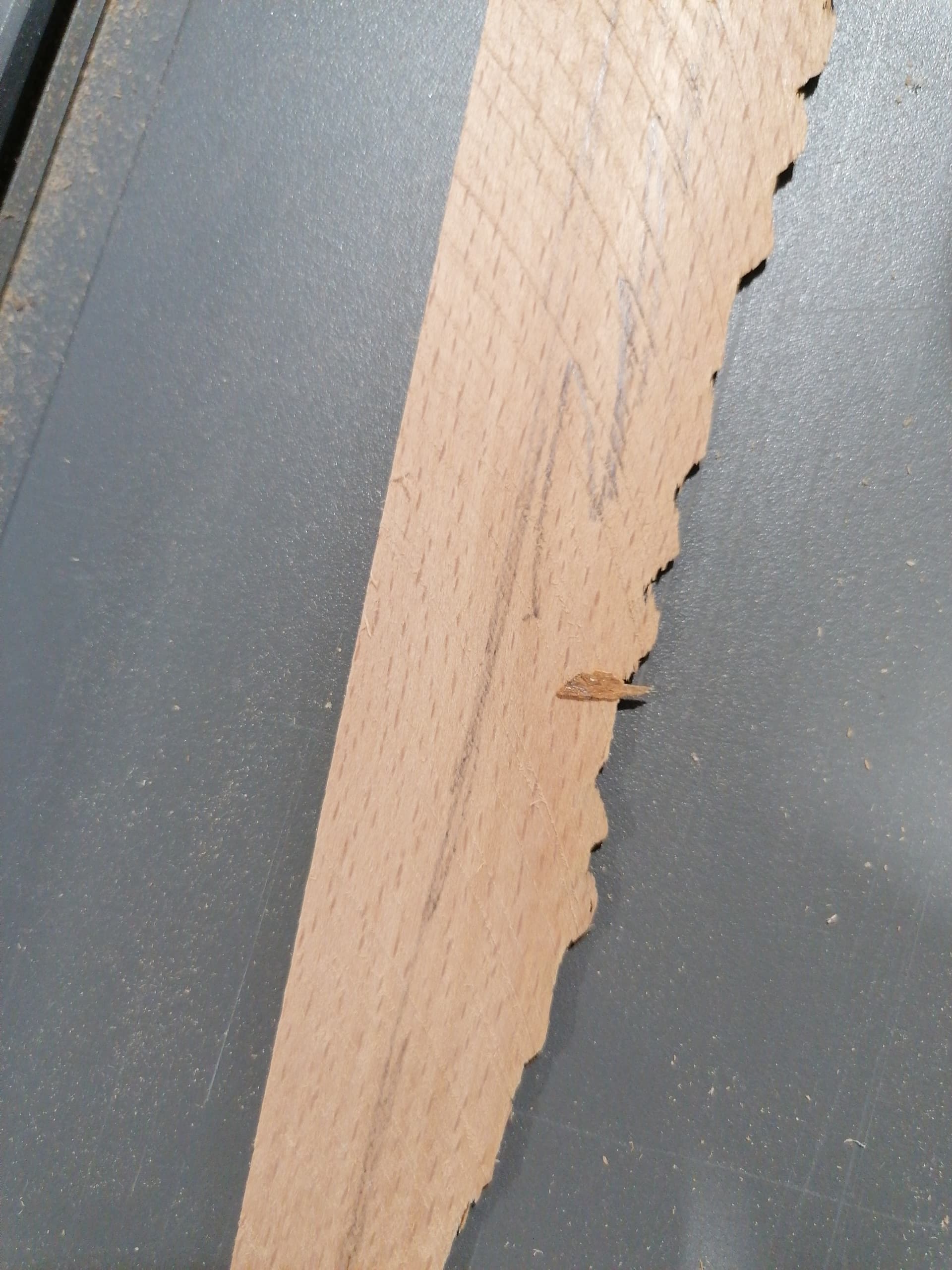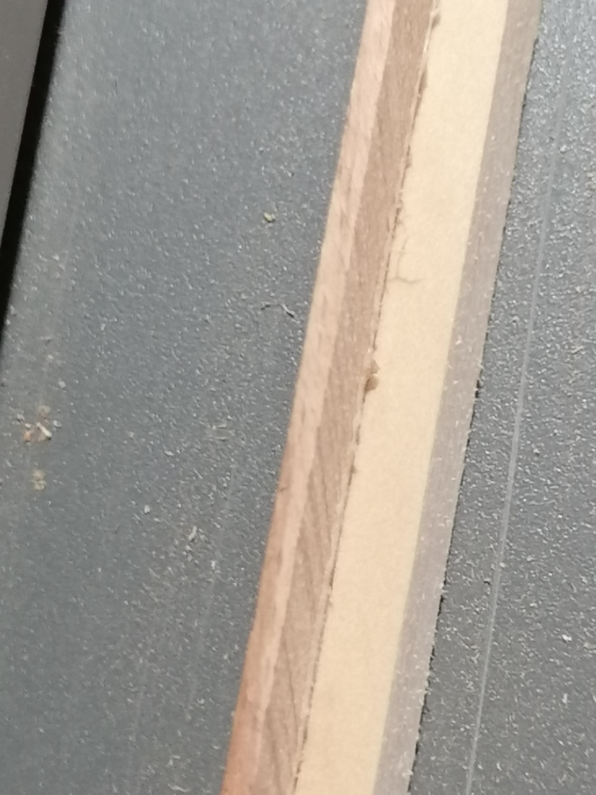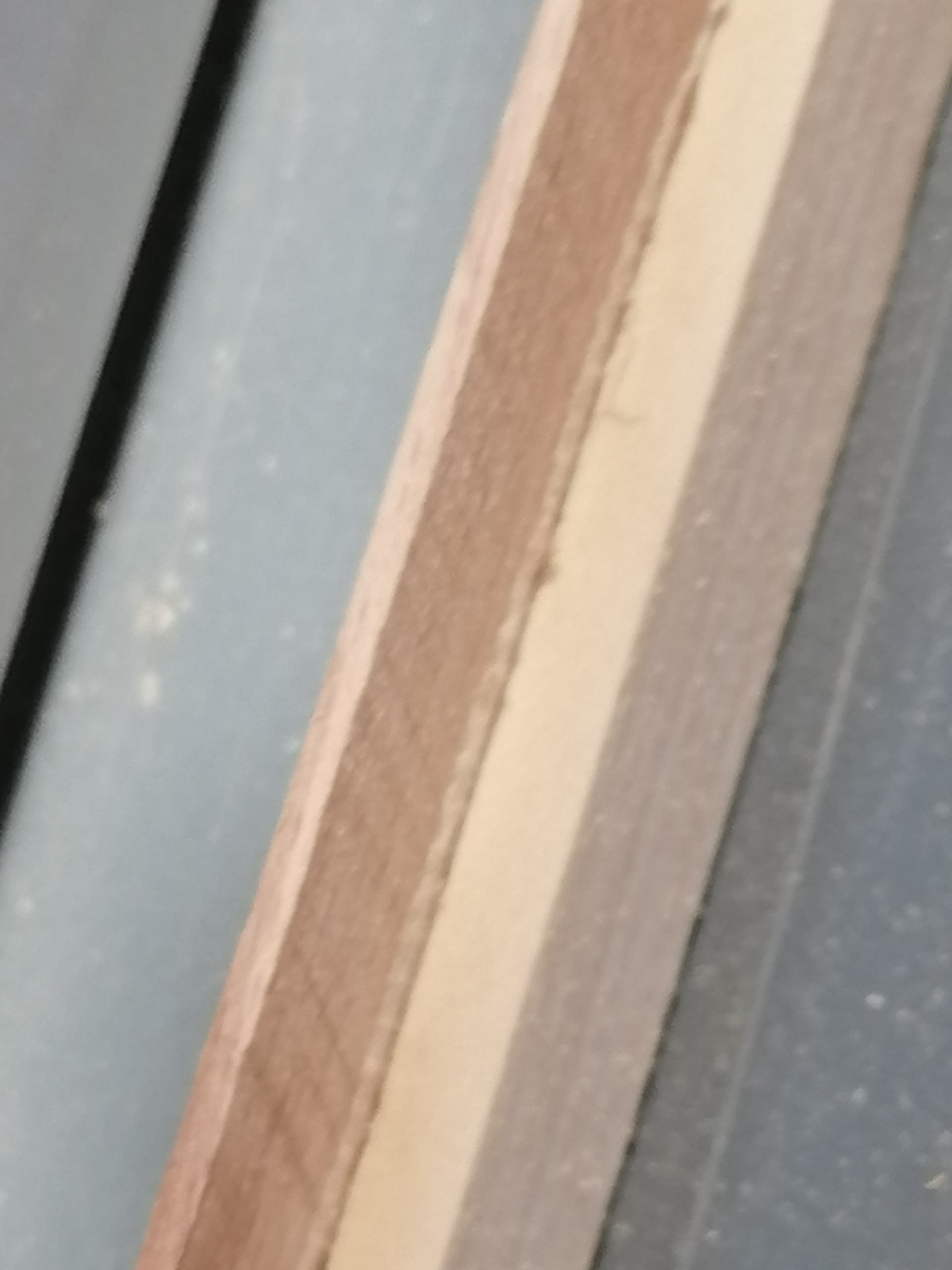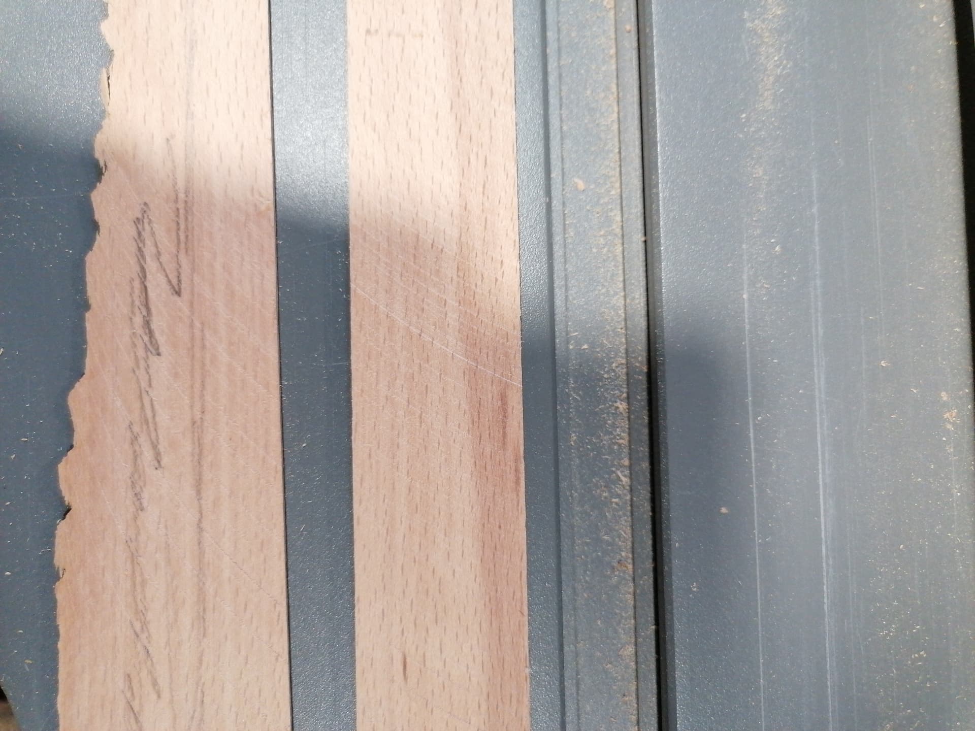 Hay que cortar una tira fina aprovechando el único resto de madera compatible. Un grosor de apenas 2 milímetros. Si lo pones tal cual en la mesa de la sierra haces algo muy peligroso pues además de ser muy fino, sin rigidez, se colará por debajo de la guía tope, intentarás evitarlo y no volverás a sacarte los mocos con esa mano.