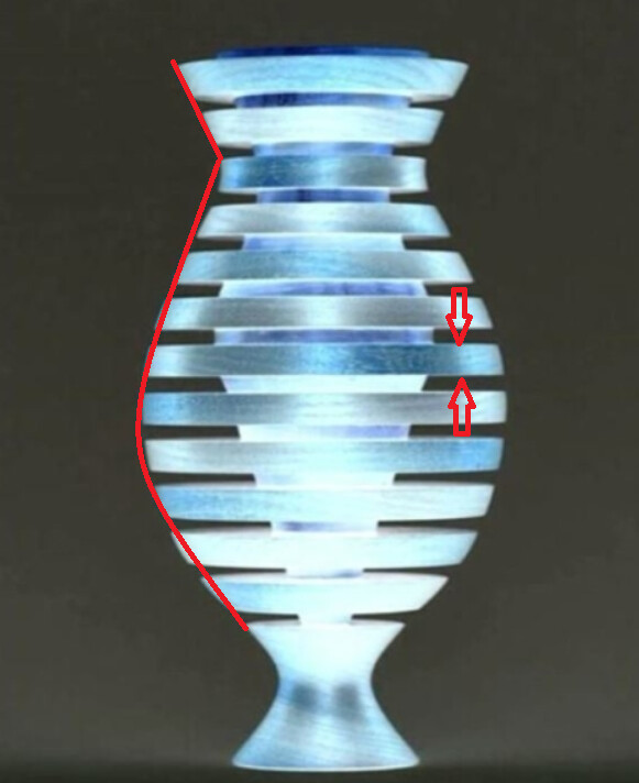 es evidente que hay que hacer 2 jarrones y cortarlos por el cuello (al claro) ya que de otra manera es imposible meter rodajas que seran mas chicas que el borde superior o la “panza” del jarron claro, haría un jarron (claro) y uno oscuro que sería el “negativo” de la silueta, lo cortaria en rodajas y cortaria el cuello del jarron claro para que entren las rodajas, luego con una rodaja (que tape el corte del cuello) y una repasada en torno