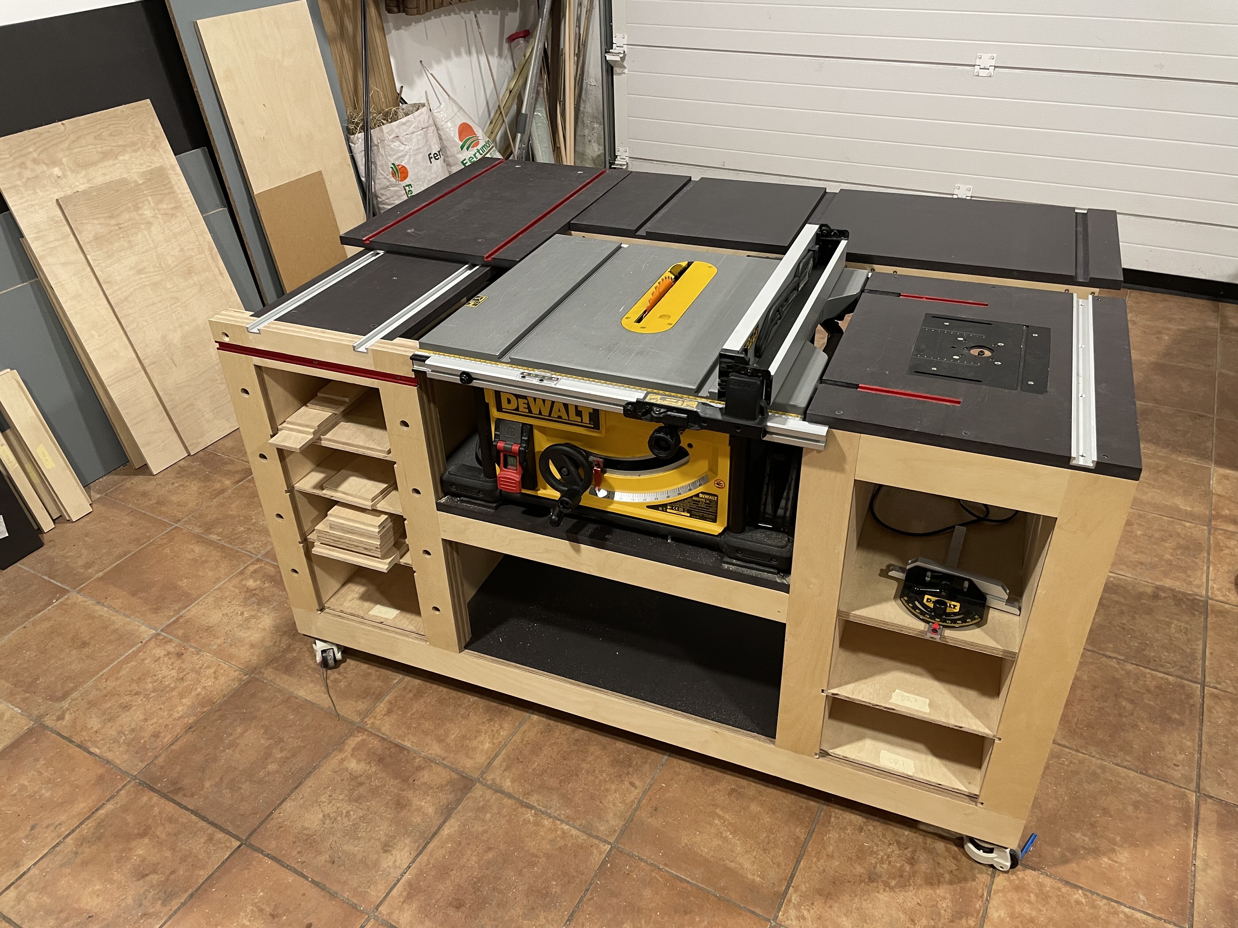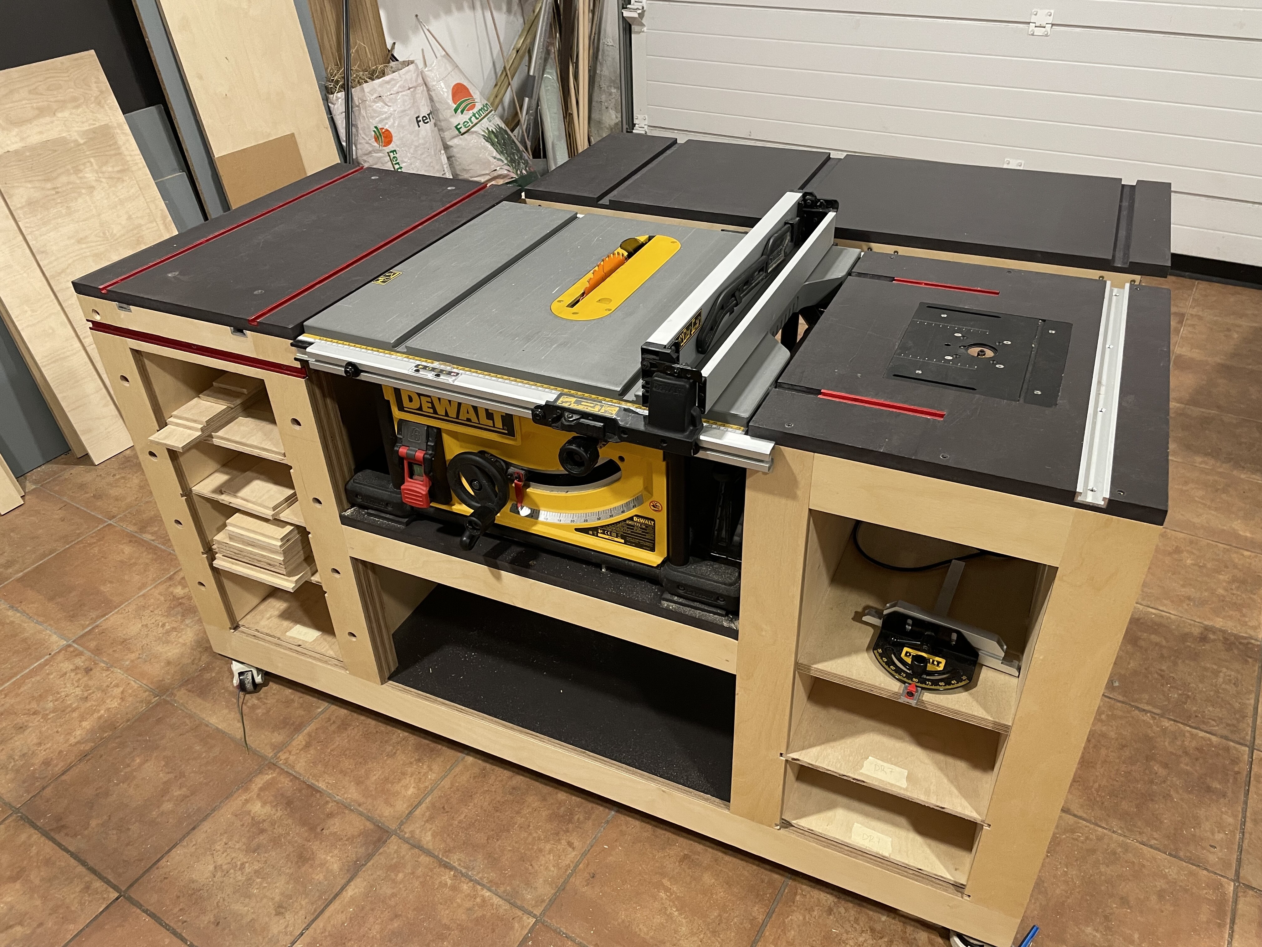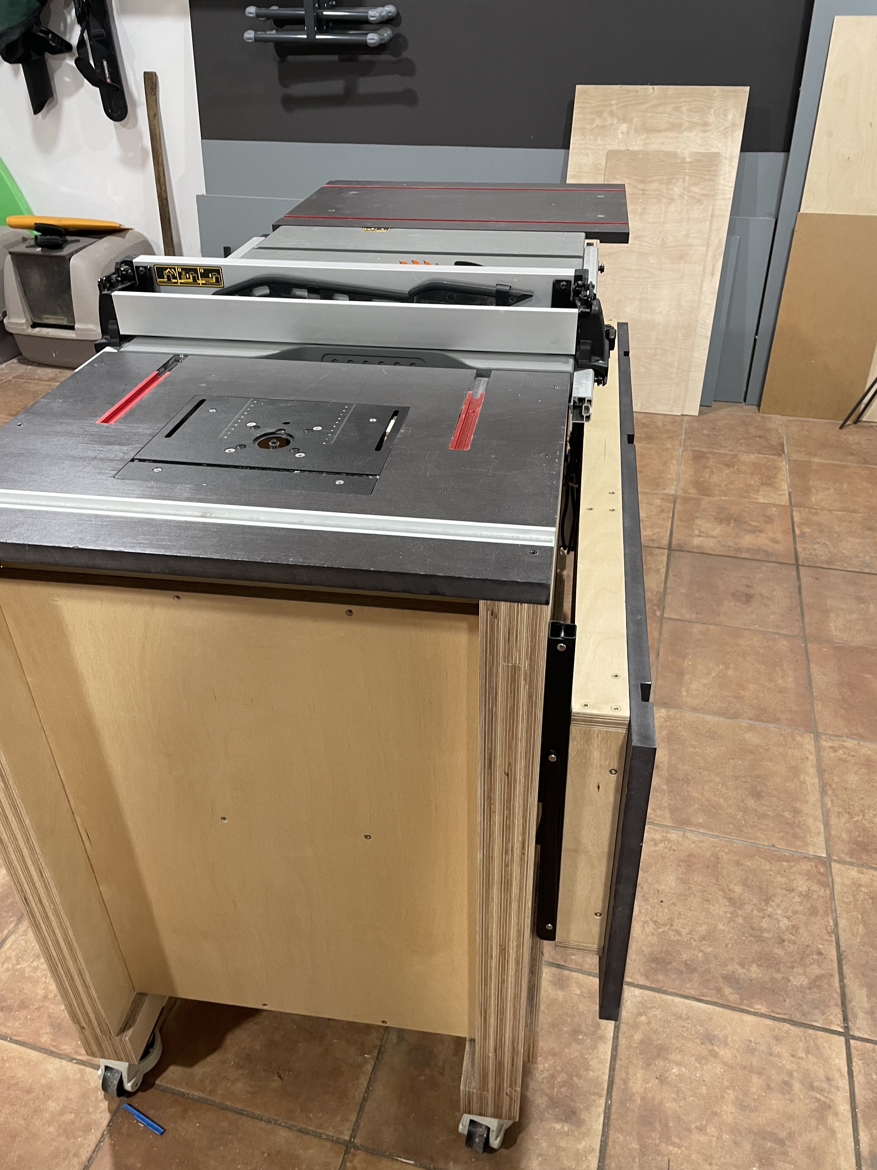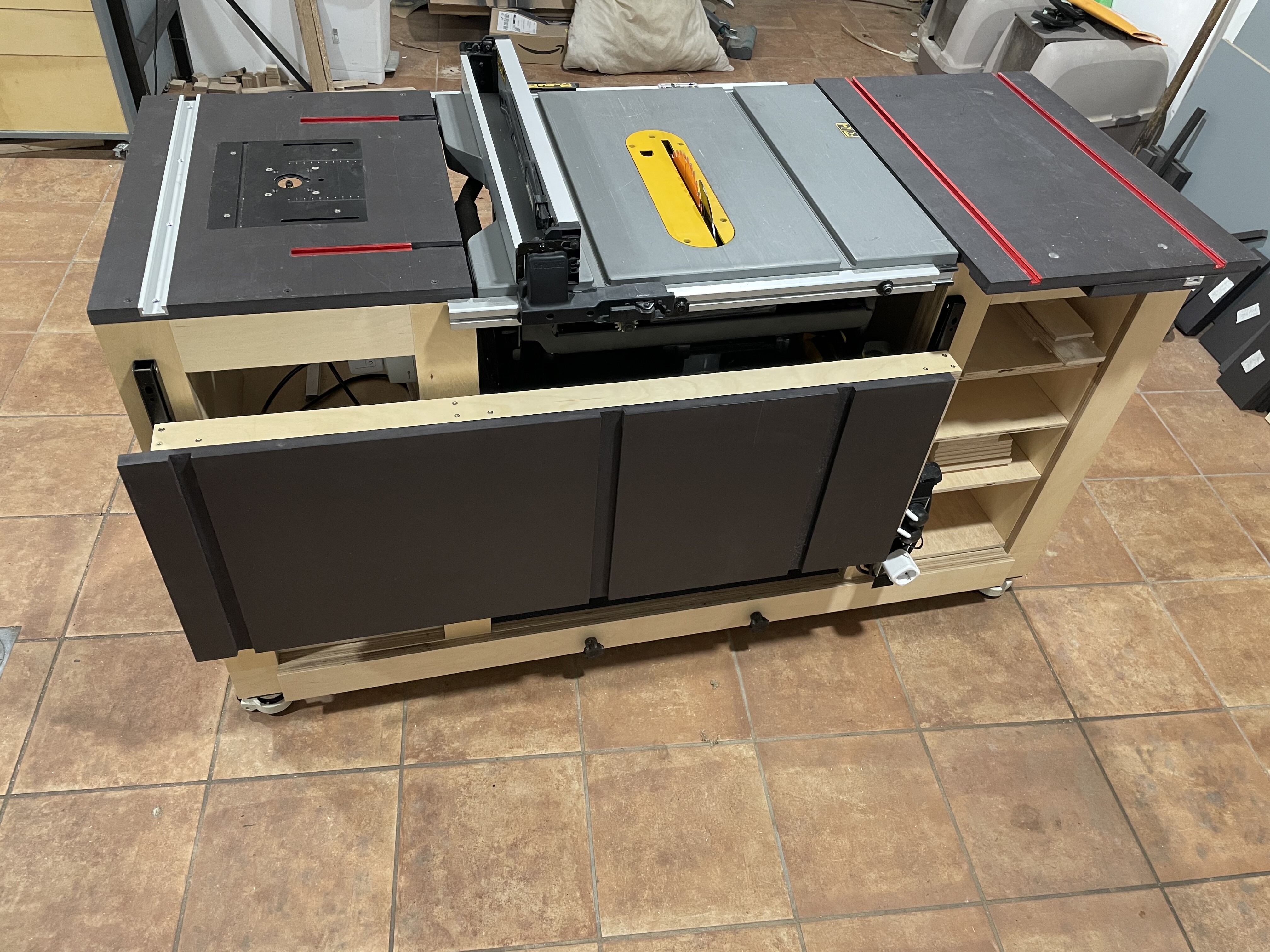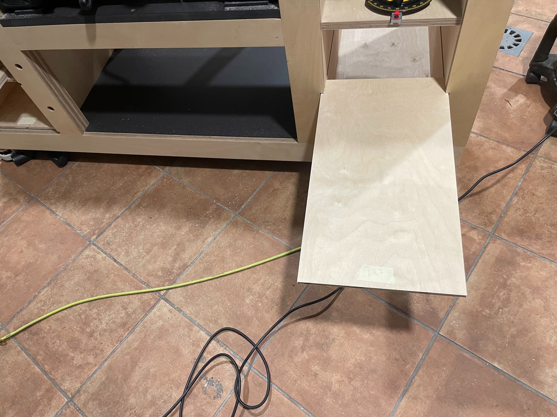 De hecho hoy mismo le saqué partido por primera vez. Por la mañana corté todas las piezas para hacer los cajones, y para eso usé un tablero de 250x125x9mm de abedul, y que gustazo poder cortarlo sin ir haciendo equilibrios con la ayuda de tres caballetes de rodillo.