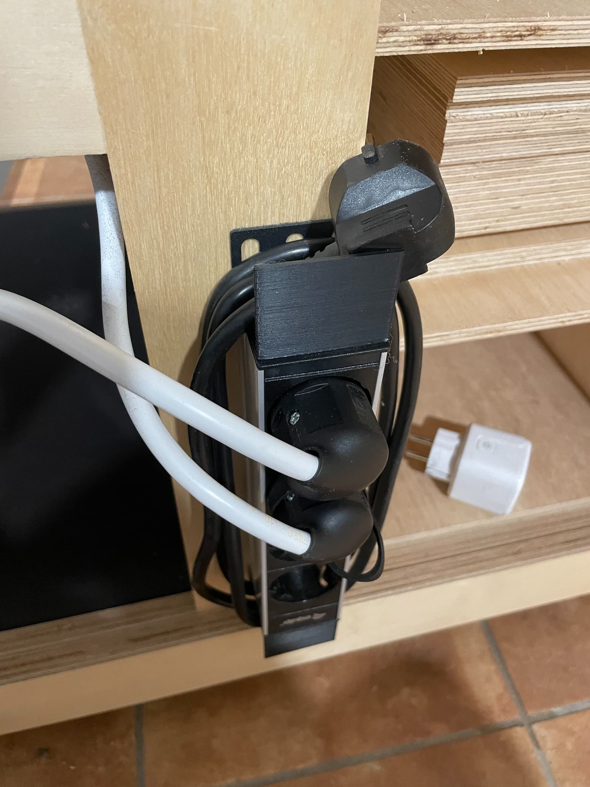 También imprimí en 3D estas piezas para atornillar a la regleta que me permiten enrollar el cable mejor cuando voy a recoger el banco en su hueco, porque si es cable cae lo pisas con las propias ruedas del banco y se atranca. Pequeñas mejoras de ergonomía que se van detectando con el uso,