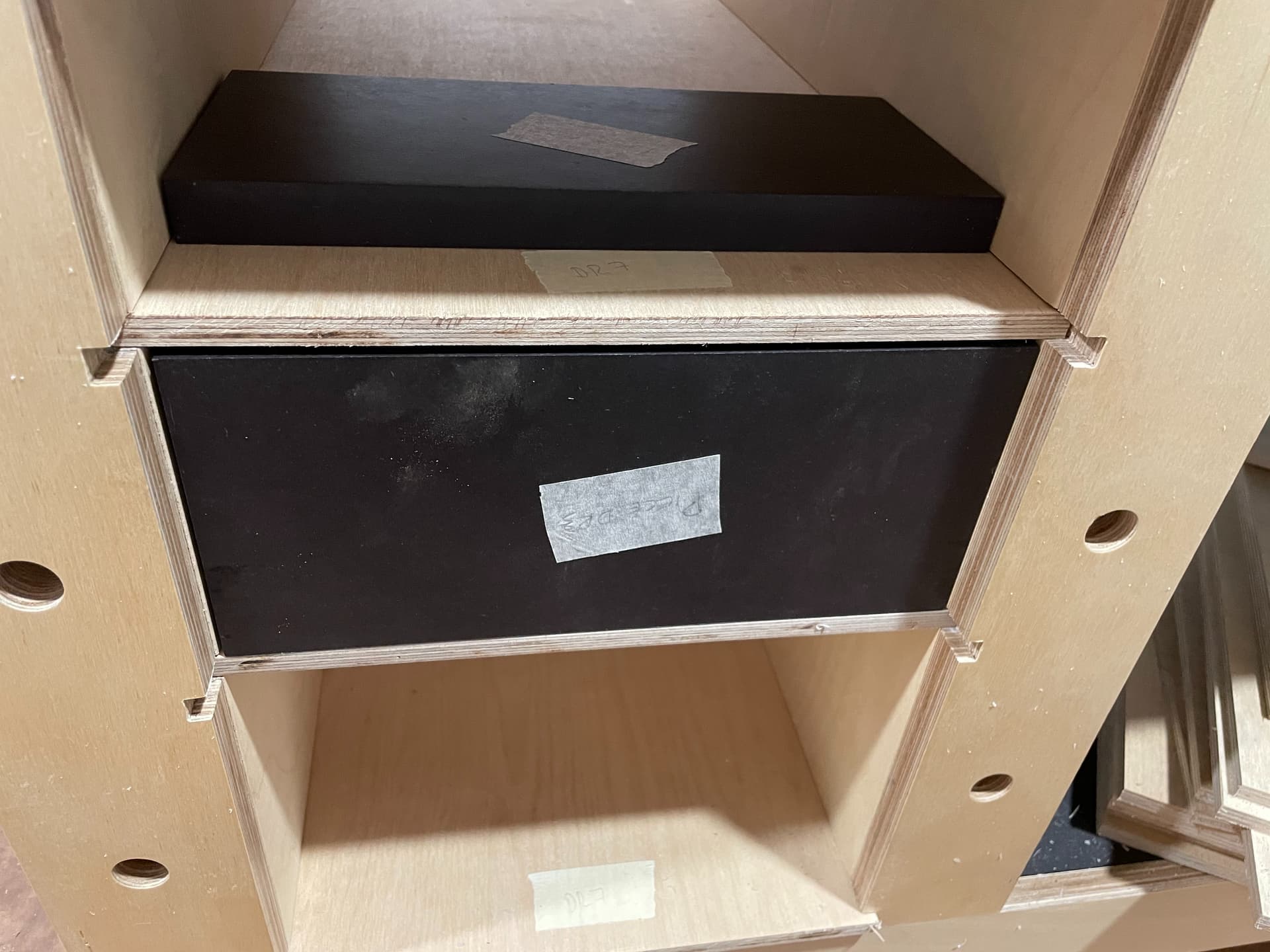 En retrospectiva podía haber echo lo mismo y fresar la parte de abajo del frente de cajón para que no se viese la base desde delante, pero no quiero cortar y barnizar nuevos frentes de cajón y tampoco me parece que quede mal la base vista, dado que hay más canto de contrachapado a la vista por los alrededores.